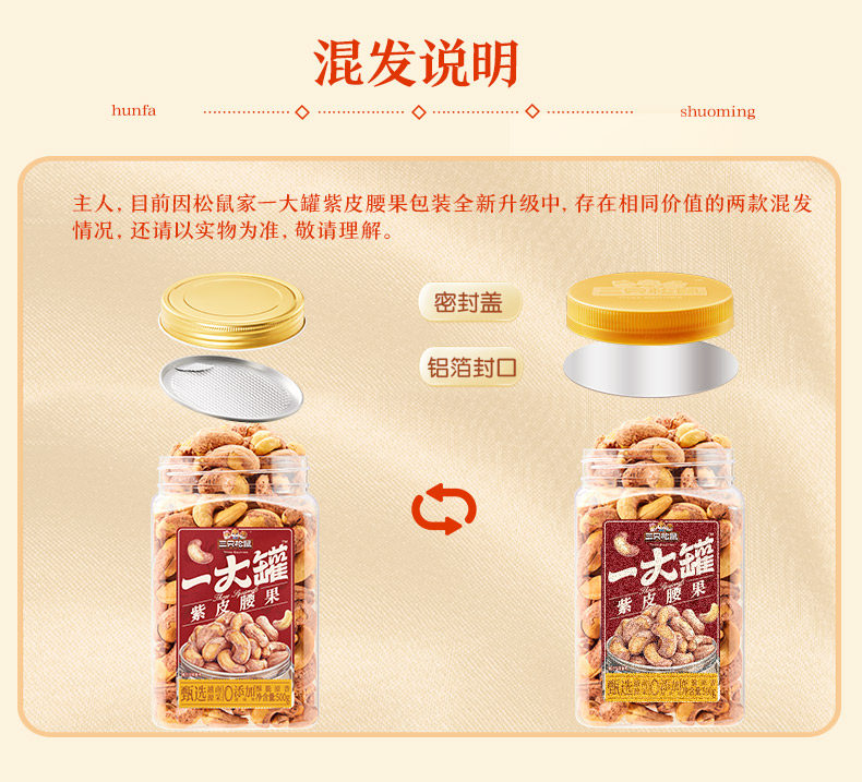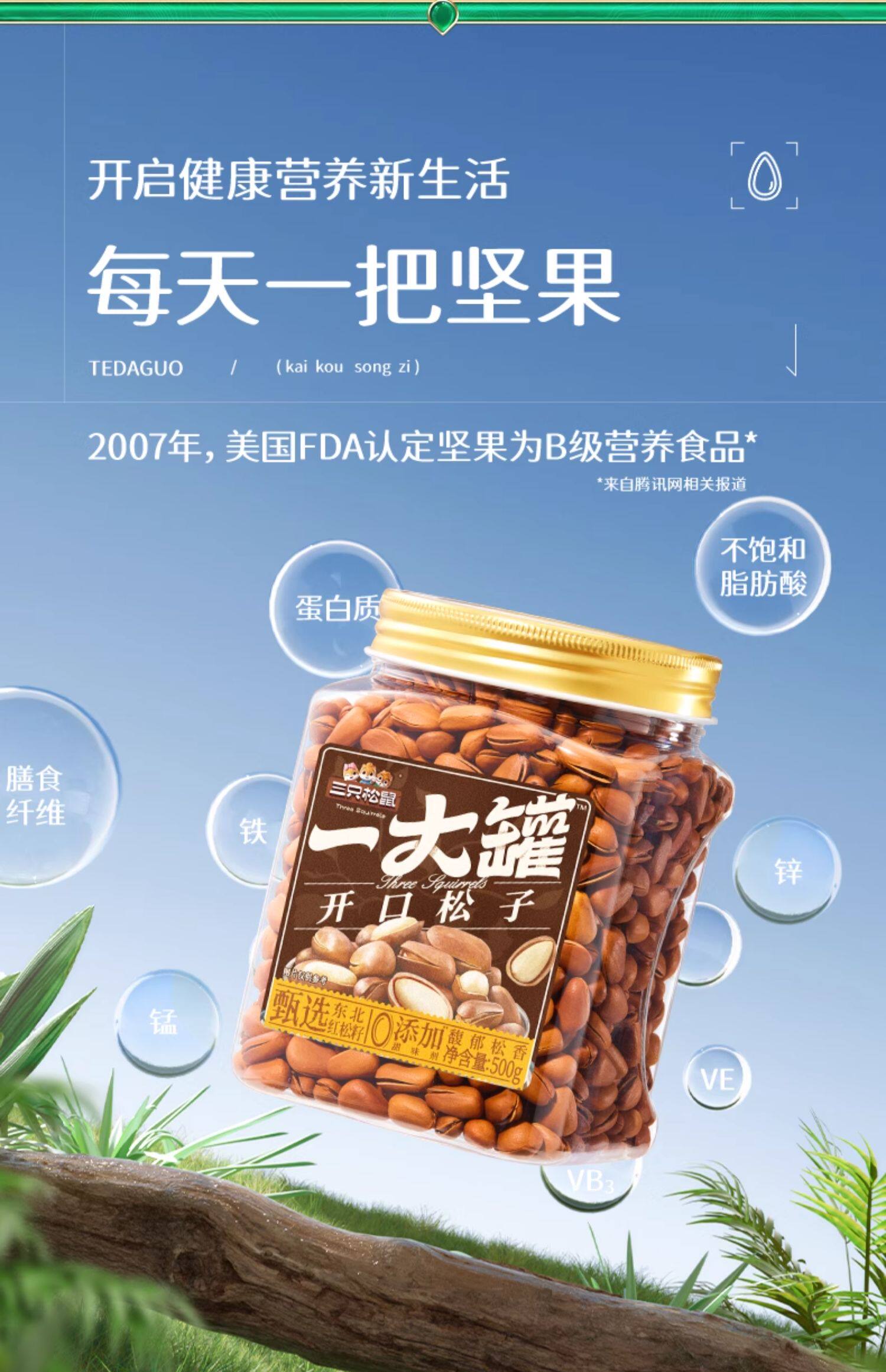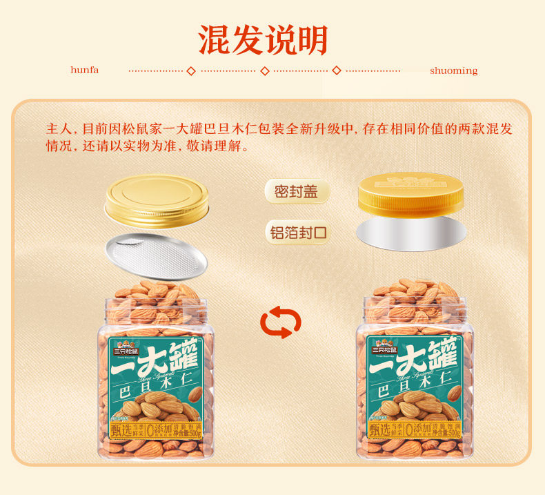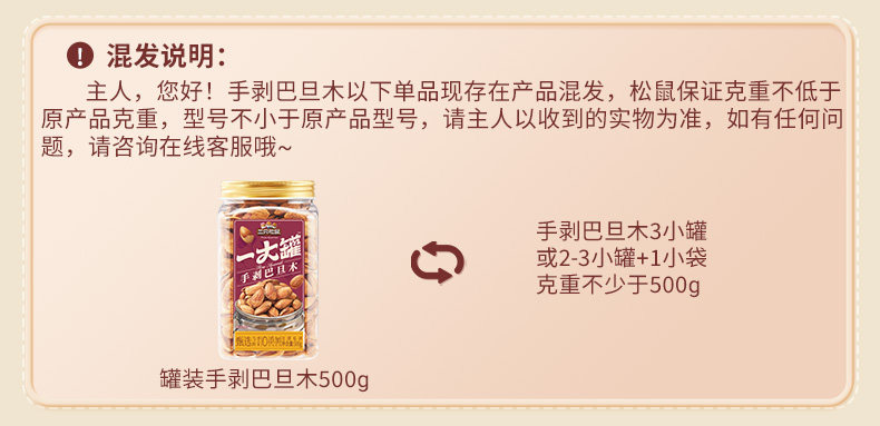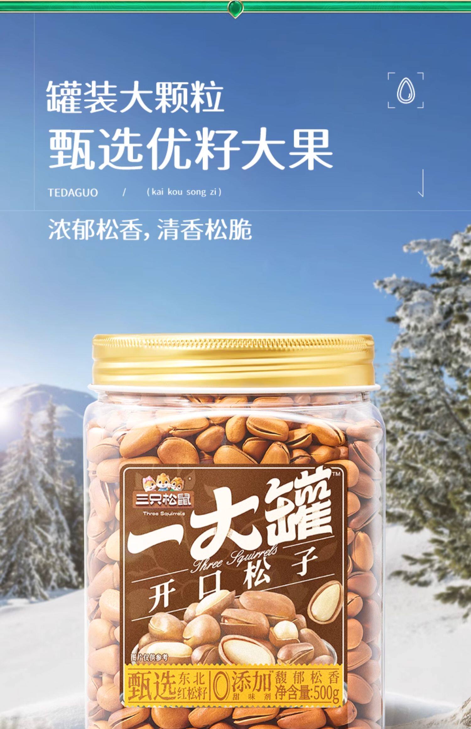 | Packaging specifications | [product mixed] amber walnut kernel 500gx1 can, affordable package,[a large jar] macadamia nuts 500g_diameter 24mm+,[benefits] canned macadamia nut gift box 4 cans/920g,[a large jar] hand-peeled almonds 500g_in shells,[a large jar] purple cashew nuts 500g,[a large jar] pistachios 500g_22-27 pieces/oz,[a large jar] daily nuts 500g_pure nuts,[a large jar] open pine nuts 500g_1150 type,[product mixed] a large can of almonds 500g_without shells,[a large jar] pecans 500g/about 78 pieces/jin,[a large jar] charcoal roasted cashew nuts 500g_cashew content ≥80%,[crispy] charcoal roasted cashew nuts 500g/can_cashew content ≥60%,[canned pistachio gift box 4 cans/920g],[canned northeast open pine nuts gift box 4 cans/1040g],[canned purple cashew nut gift box 4 cans/880g] |