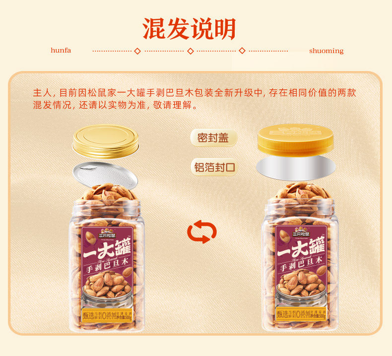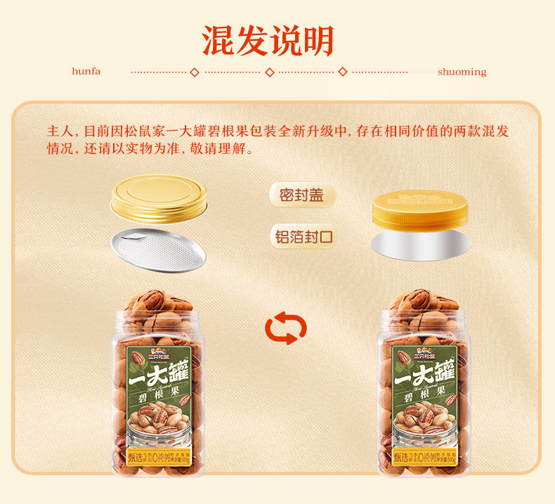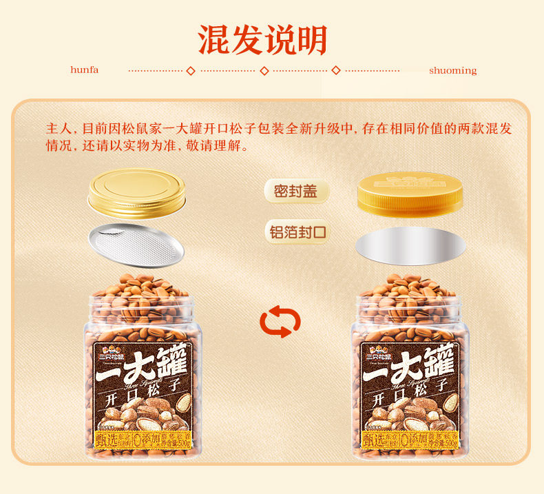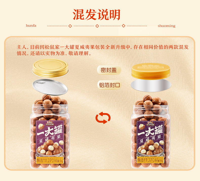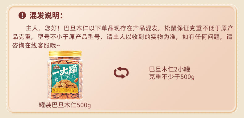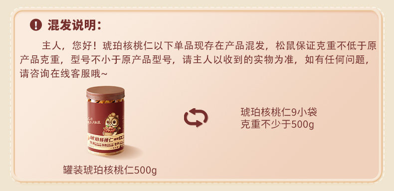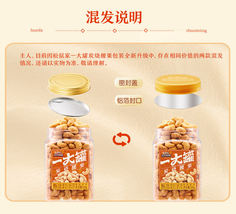 | Packaging specifications | [product mixed] amber walnut kernel 500gx1 can, affordable package,[a large jar] macadamia nuts 500g_diameter 24mm+,[benefits] canned macadamia nut gift box 4 cans/920g,[a large jar] hand-peeled almonds 500g_in shells,[a large jar] purple cashew nuts 500g,[a large jar] pistachios 500g_22-27 pieces/oz,[a large jar] daily nuts 500g_pure nuts,[a large jar] open pine nuts 500g_1150 type,[product mixed] a large can of almonds 500g_without shells,[a large jar] pecans 500g/about 78 pieces/jin,[a large jar] charcoal roasted cashew nuts 500g_cashew content ≥80%,[crispy] charcoal roasted cashew nuts 500g/can_cashew content ≥60%,[canned pistachio gift box 4 cans/920g],[canned northeast open pine nuts gift box 4 cans/1040g],[canned purple cashew nut gift box 4 cans/880g] |