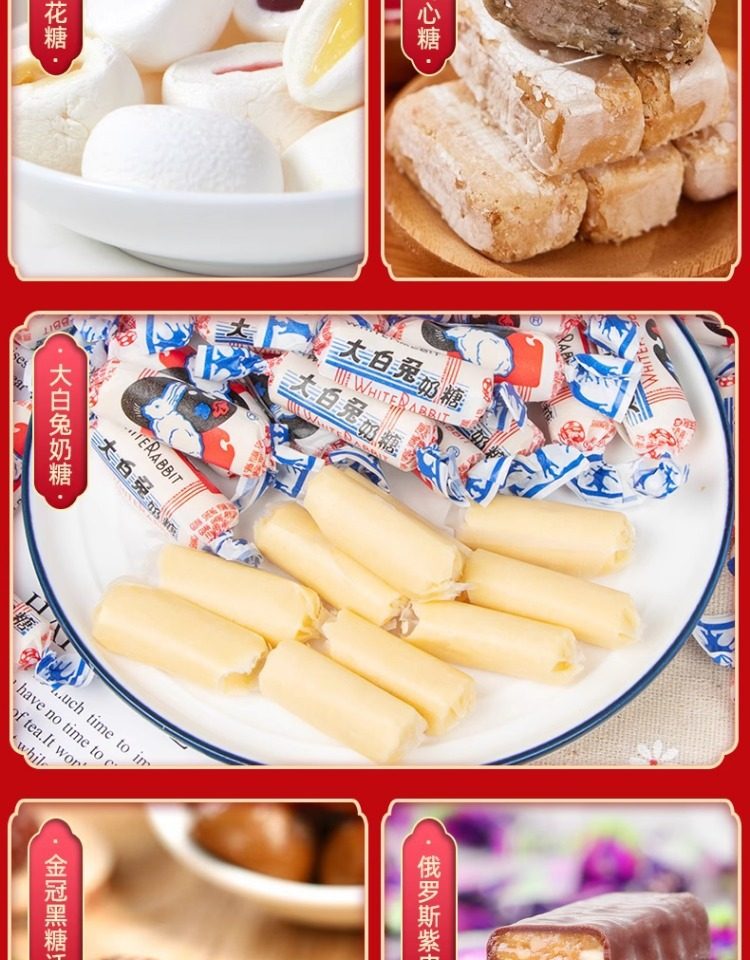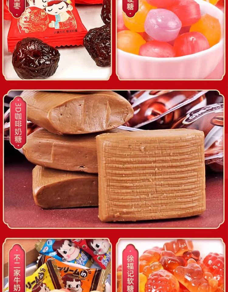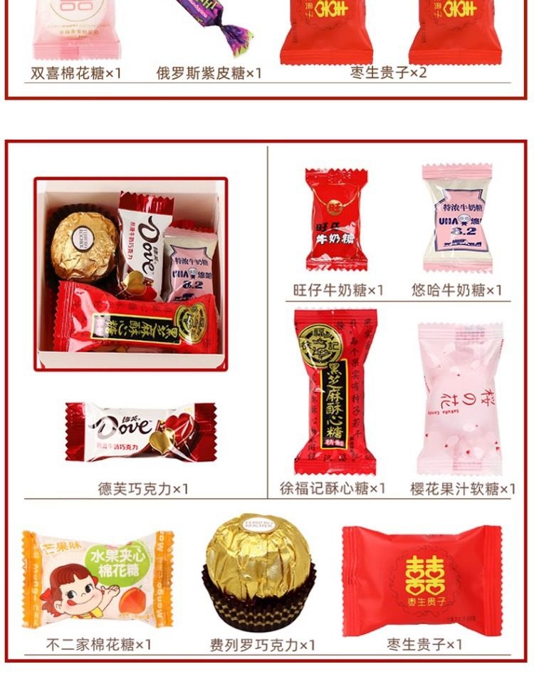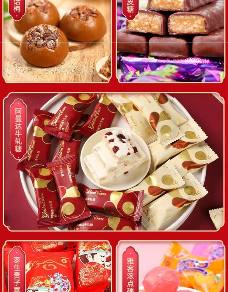 | Packaging specifications | Please see the large picture for size - multi-brand mixed candy 500g (package a - about 100 pieces),Please see the large picture for size - multi-brand mixed candies 500g (package b - about 80 pieces),Please see the large picture for size - multi-brand mixed candy 500g (set c - about 80 pieces),Please see the large picture for size - alpine hard candy mixed pack 500g (about 130 pieces),Please see the large picture for size - wangzai milk candy 500g (about 150 pieces),Please see the large picture for size - dove chocolate 500g (about 100 pieces),Please see the large picture for size - russian kdv purple sugar 500g (about 70 pieces),Please see the large picture for size - white rabbit milk candy 500g (about 85 pieces),Please see the large picture for size - zhenghong double happiness festive dates 500g (about 35 pieces),Please see the large picture for size - zaosheng guizi dense dates 500g (about 35 pieces),Please see the big picture for size - kiss baby festive dates 500g (about 35 pieces),Please see the big picture for the size - wedding gift festive dates 500g (about 35 pieces),Please see the large picture for size - zaosheng guizi sweet dates 500g (about 36 pieces),Please see the big picture for the size - lucky day festive dates 500g (about 32 pieces),Please see the big picture for the size - big bag - daxi's auspicious date candied dates 500g (about 20 bags),Please see the large picture for size - 500g of jujube and walnut (about 53 pieces),Please see the big picture for the size - happy milk dates 500g (about 31 pieces),Please see the large picture for size - fujiya milk candy mixed flavor 500g (about 100 pieces),Please see the large picture for size - yoha milk candy mixed flavor 500g (about 100 pieces),Please see the big picture for size - oh oh milk candy 500g (about 95 pieces),Please see the large picture for size - sakura double happiness marshmallow 500g (about 60 pieces),Please see the large picture for size - hsu fu chi marshmallow 500g (about 60 pieces),Please see the big picture for the size - tangliyouchang marshmallow 500g (about 60 packs),Please see the large picture for size - snow cookies marshmallows 500g (about 80 packs),Please see the big picture for the size - golden crown joy marshmallow 500g (about 70 pieces),Please see the large picture for size - snowy marshmallow 500g (about 48 packs),Please see the large picture for size - golden delicious peanut nougat 500g (about 50 pieces),Please see the big picture for size - little brother malisin 500g (about 110 pieces),Please see the large picture for size - golden crown triangular bag malisin 500g (about 42 bags),Please see the large picture for size - hsu fu chi crispy candies 500g (about 38 pieces),Please see the big picture for the size - happy family peanut crispy 500g (about 42 pieces),Please see the large picture for size - mai de hao chocolate flavored oats 468g (about 40 pieces),Please see the large picture for size - longke snowflake crispy 500g (about 42 packs),Please see the large picture for size - golden crown cranberry snow crisp 500g (about 42 packs),Please see the large picture for size - golden crown double happiness snow crisp 500g (about 47 pieces),Please see the big picture for size - xue ke zi double happiness cranberry snowflake crispy 500g (about 50 pieces),Please see the large picture for size - mai de hao snowflake crispy cranberry flavor 500g (about 45 pieces),Please see the large picture for size - golden crown wedding gift cranberry snow crisp 500g (about 40 pieces),Please see the large picture for size - white peach flavored hard candy 500g (about 115 pieces),Please see the big picture for the size - longke xishi milk crisp mixed flavor 500g (about 60 pieces),Please see the large picture for size - hongyuan tangerine peel candy 500g (about 170 pieces),Please see the large picture for size - golden crown brown sugar plum 468g (about 70 pieces),Please see the large picture for size - yake thick filling hard candy 500g (about 110 pieces),Please see the big picture for size - golden crown let's get married hard candy 500g (about 105 pieces),Please see the large picture for size - fruit hard candy mixed flavor 500g (about 110 pieces),Please see the big picture for the size - golden crown full of joy hard candy 500g (about 68 pieces),Please see the large picture for size - disney double flavor fruit hard candy 500g (about 65 pieces),Please see the large picture for size - orion fruit gummy candy 500g (about 24 packs),Please see the large picture for size - hsu fu chi juice gummy candy 500g (about 35 packs),Please see the large picture for size - hsu fu chi heart shaped gummy candy 500g (about 62 pieces),Please see the large picture for size - happy cranberry gummies 500g (about 65 pieces),Please see the large picture for size - ococo cranberry gummies 500g (about 67 pieces),Please see the large picture for size - yake festive love gummies 500g (about 30 packs),Please see the large picture for size - strawberry bear white peach flavor jelly 500g (about 26 pieces),Please see the large picture for size - strawberry bear fruit flavor gummies 500g (about 32 packs),Please see the large picture for size - strawberry bear cranberry gummies 500g (about 58 pieces),Please see the large picture for size - golden delicious orange gummy candy 500g (about 30 pieces),Please see the big picture for size - peach you happy gummy candy 500g (about 60 pieces),Please see the large picture for size - yake corn roasted gummy candy 500g (about 42 pieces),Please see the large picture for size - yake mango gummy candy 500g (about 48 pieces),Please see the large picture for size - longke wedding gift nougat 500g (about 46 pieces),Please see the large picture for size - golden crown amanda nougat 500g (about 45 pieces),Please see the large picture for size - golden crown double happiness nougat 500g (about 50 pieces),Please see the big picture for the size - xue ke zi xi small round cake 500g 