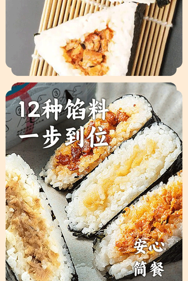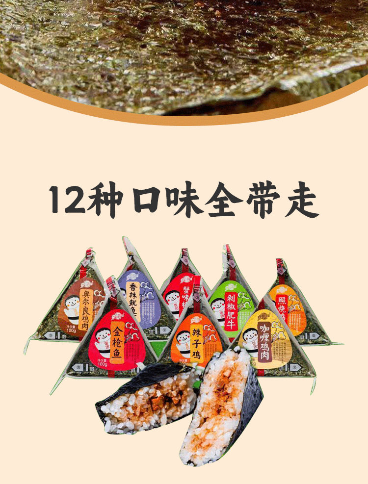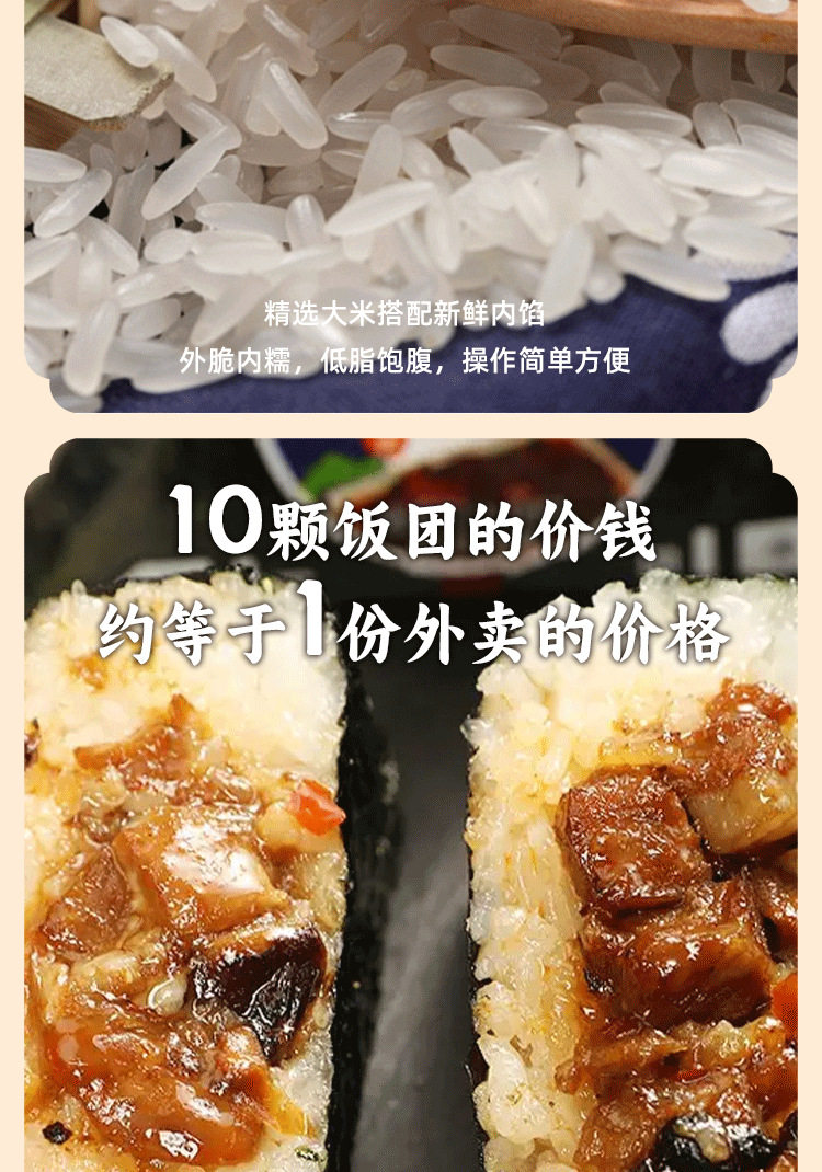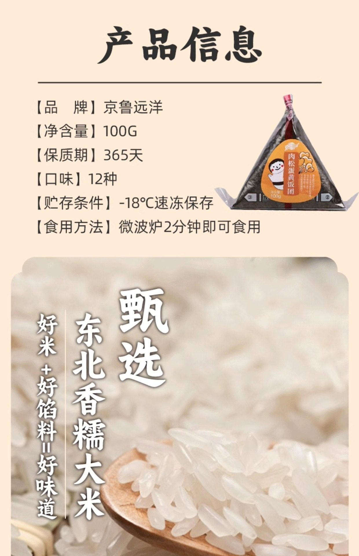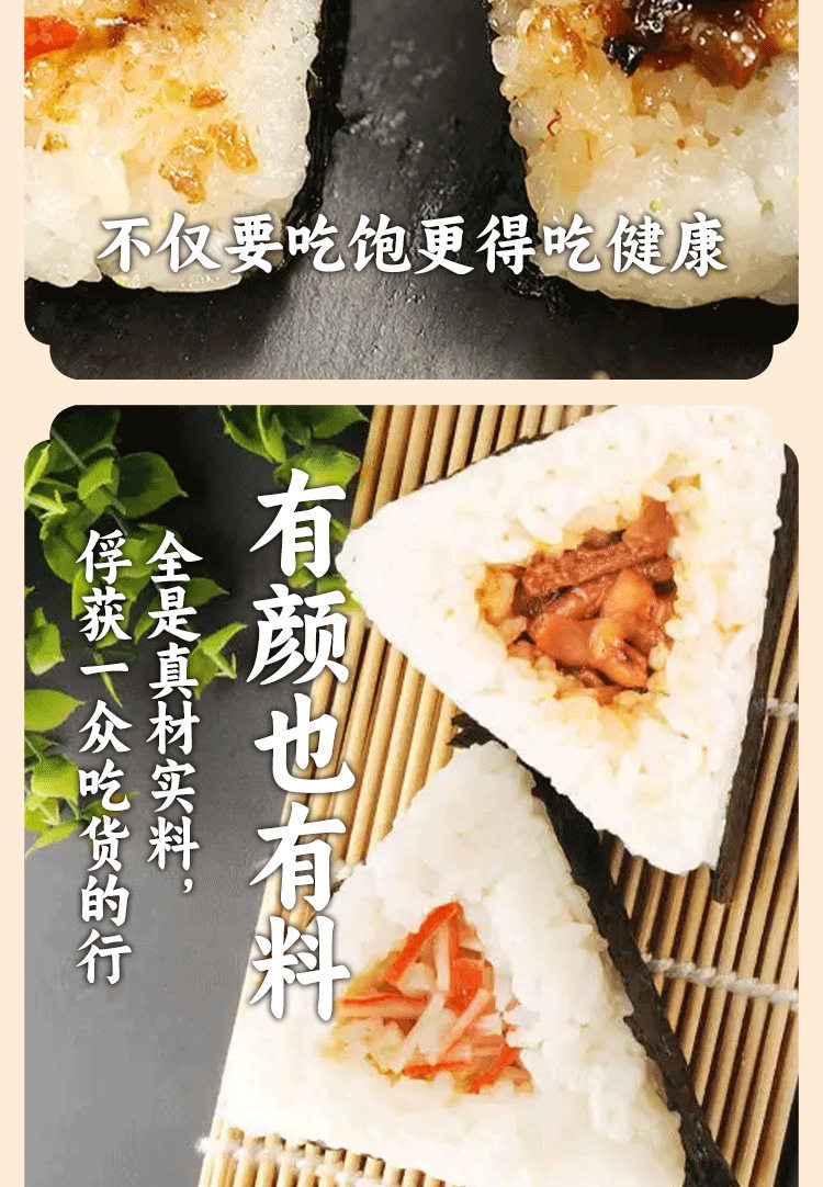 | Packaging specifications | [do not shoot] activity introduction: 20 15% off +30 20% off +60 25% off +120 30% off (10 rice ball set),[large quantity and great value] big mouth rice balls - orleans 150g - 10 pieces,[large quantity and great value] big mouth rice balls - crispy egg yolk 150g - 10 pieces,[large quantity and great value] large mouth rice balls - 5 orleans + 5 crispy egg yolks,[large quantity and great value] big mouth rice balls-cheese crab flavor sticks 150g-10 pieces,[large quantity and great value] large mouth rice balls - 5 pieces orleans + 5 pieces cheese crab flavor,[large quantity and great value] big mouth rice balls - tomato beef 150g - 10 pieces,[large quantity and great value] big mouth rice balls - 5 pieces orleans + 5 pieces tomato beef,[large quantity and great value] big mouth rice balls - bbq flavor shrimps 150g - 10 pieces,[large quantity and great value] large mouth rice balls - 5 flavors 150g - 10 pieces,【manchu-han imperial feast】14 flavors 100g - 14 pieces,[children don’t eat spicy food] teriyaki + aoliang + crispy pine + golden gun + curry 2 each,[recommended by regular customers] teriyaki 4+ orleans 4+ curry 2,[hot flavor] orleans 6 pieces + teriyaki 6 pieces (rating is 3 yuan),[cheap and delicious] (pork chop burger + hong kong burger) 120g*6 pieces,[so delicious] (cheese burger + pork chop burger + hong kong burger) 120g*9 pieces,[thin skin and lots of filling] wufang cake 130g*6 pieces,[fast food freedom] (chicken leg burger + chicken roll) 140g*6 pieces,[hot flavor] orleans 6 pieces + curry 6 pieces,[hot flavor] orleans 6 pieces + tuna 6 pieces,[hot flavor] orleans 6 pieces + crispy egg yolk 6 pieces,[hot flavor] 6 orleans + 6 spicy squid,[beef flavor] 6 pieces of black pepper beef + 6 pieces of red braised beef,[hot flavor] orleans 6 pieces + red bean paste 6 pieces,[halal rice balls] orleans 6 pieces + chopped pepper beef 6 pieces,[like spicy food] chopped pepper + spicy + black pepper beef + black pepper chicken + spicy chicken 2 each,[no chicken] 2 each of tuna + crispy egg yolk + beef + squid + crab meat,[just eat chicken] orleans + teriyaki + curry + black pepper chicken + cumin chicken 2 each,[bbq flavor] orleans + teriyaki + cumin + black pepper chicken + black pepper beef 2 each,[shao mai breakfast] purple rice shaomai 800g (16 pieces) + sanding shaomai 800g (16 pieces),[quick breakfast] cheese hot dog sticks 195g-3 bags (9 sticks in total),[full of filling and delicious] rice burger-teriyaki chicken steak 150g-10 pieces,[full of filling and delicious] rice burger-curry chicken 150g-10 pieces,[full of filling and delicious] rice burger-2 flavors 150g-10 pieces,[seaweed sushi] 2 flavors 150g-10 bags (60 pieces),Triangular rice balls - orleans chicken 100g - 10 pieces,Triangular rice balls-tuna 100g*10 pieces,Triangular rice balls-teriyaki chicken steak 100g*10 pieces,Triangular rice balls-crispy egg yolks 100g*10 pieces,Triangular rice balls-curry chicken 100g*10 pieces,Triangular rice balls-crab meat salad dressing 100g*10 pieces,Triangular rice balls-spicy diced squid 100g*10 pieces,Triangular rice balls-black pepper beef 100g*10 pieces,Triangular rice balls-cumin chicken 100g*10 pieces,Triangular rice balls-black pepper chicken 100g*10 pieces,Triangular rice balls-red braised beef 100g*10 pieces,Triangular rice balls-chopped pepper beef 100g*10 pieces,Triangular rice balls-spicy chicken 100g*10 pieces,Triangular rice balls-red bean paste 100g*10 pieces |