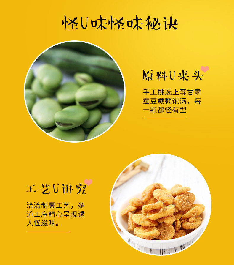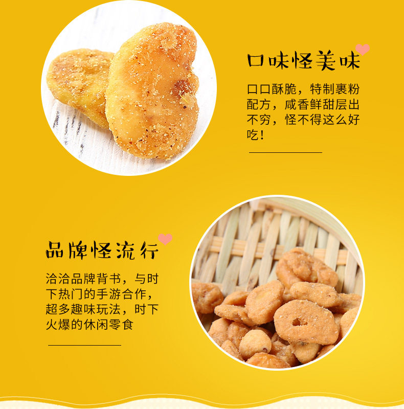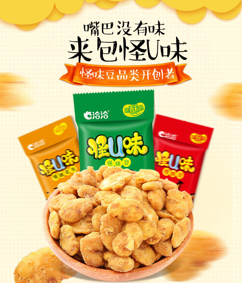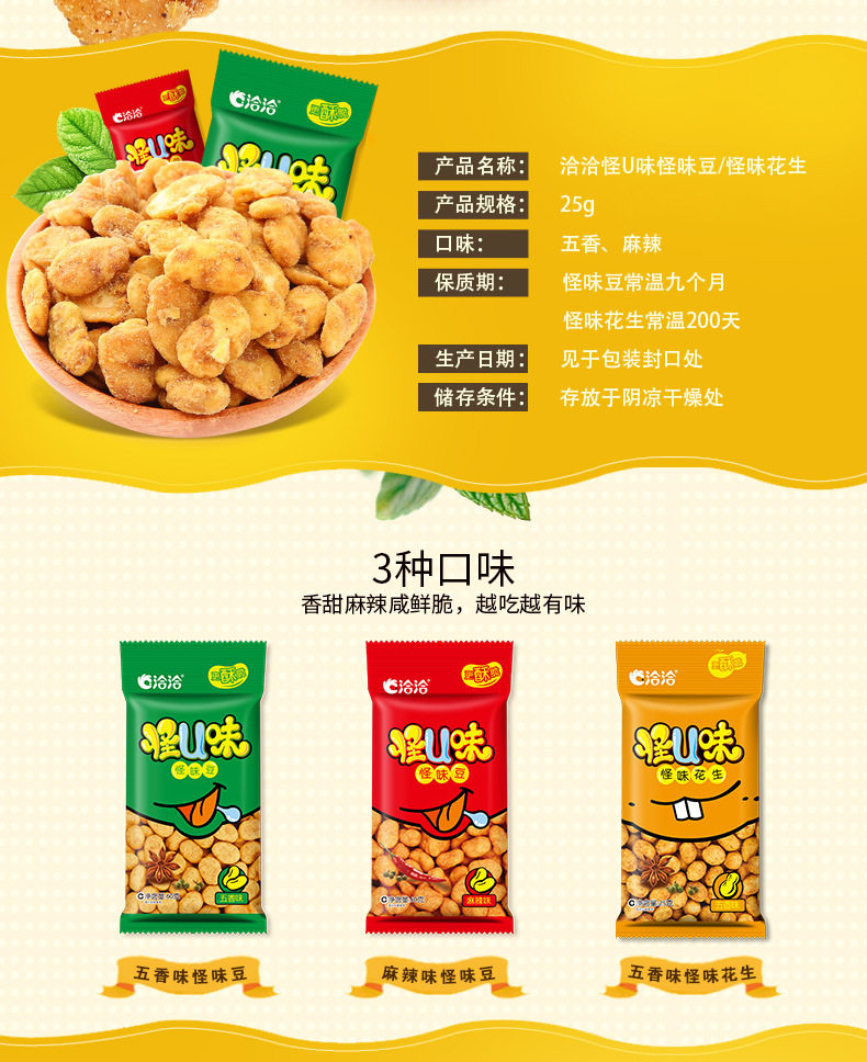 | Packaging specifications | Strange-flavored broad beans (five-flavored)*30 bags,Strange-flavored broad beans (spicy flavor)*30 bags,Strange-flavored peanuts (five-flavored)*30 bags,Mixed flavors*30 bags,Strange-flavored broad beans (five-flavored)*50 bags,Strange-flavored broad beans (spicy flavor)*50 bags,Strange-flavored peanuts (five-flavored)*50 bags,Mixed flavors*50 bags |