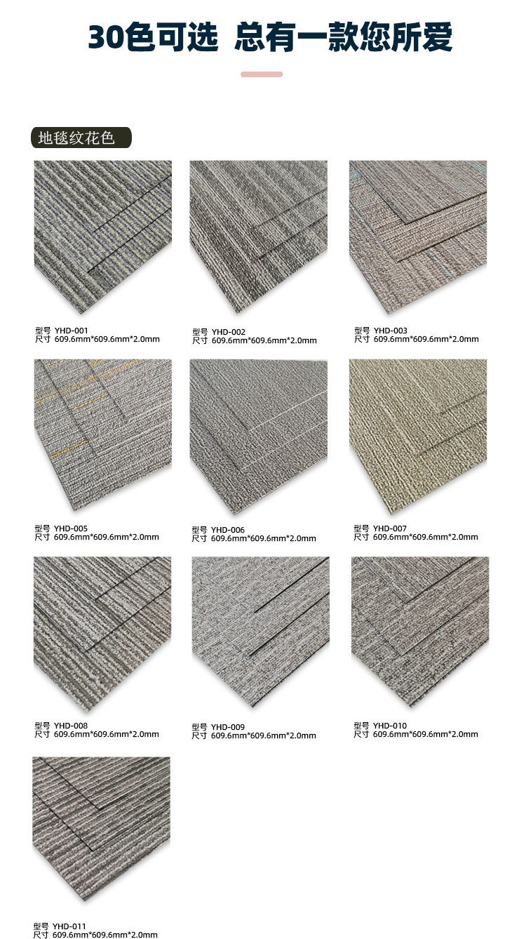 | Color | Carpet pattern series (609.6*609.6),Carpet pattern series (457.4*457.4),Stone pattern series (609.6*609.6),Stone pattern series (457.4*457.4),Wood grain series (1220*185),Wood grain series (914.4*152.4) |