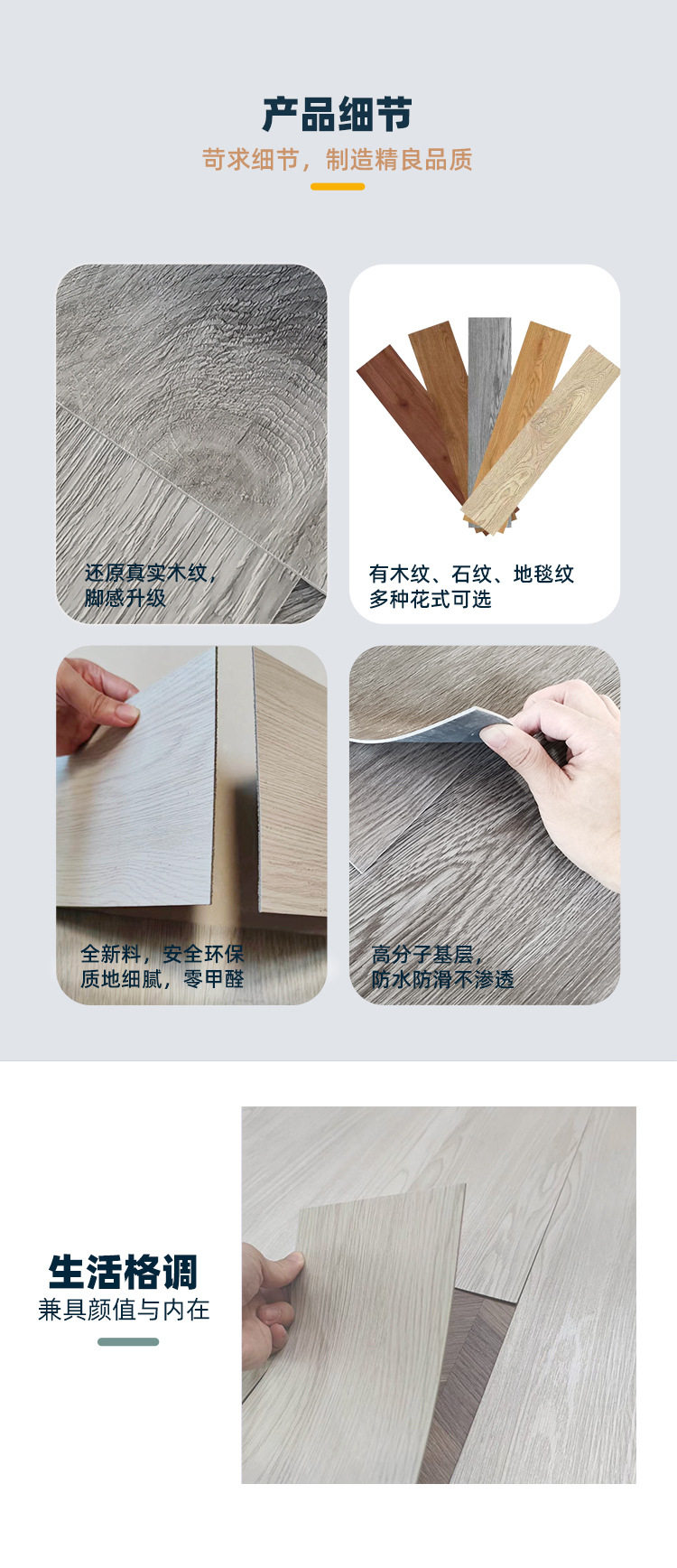 | Specification | Self adhesive backing 1.2-1.8mm customized,Dry back dry back 2.0mm in stock,Dry back dry back 3.0mm in stock,Loose lay self-immersion adsorption 4.0mm customized,Loose lay self-immersion adsorption 5.0mm customized,Click lock 4.0mm customized,Click lock 5.0mm customized |