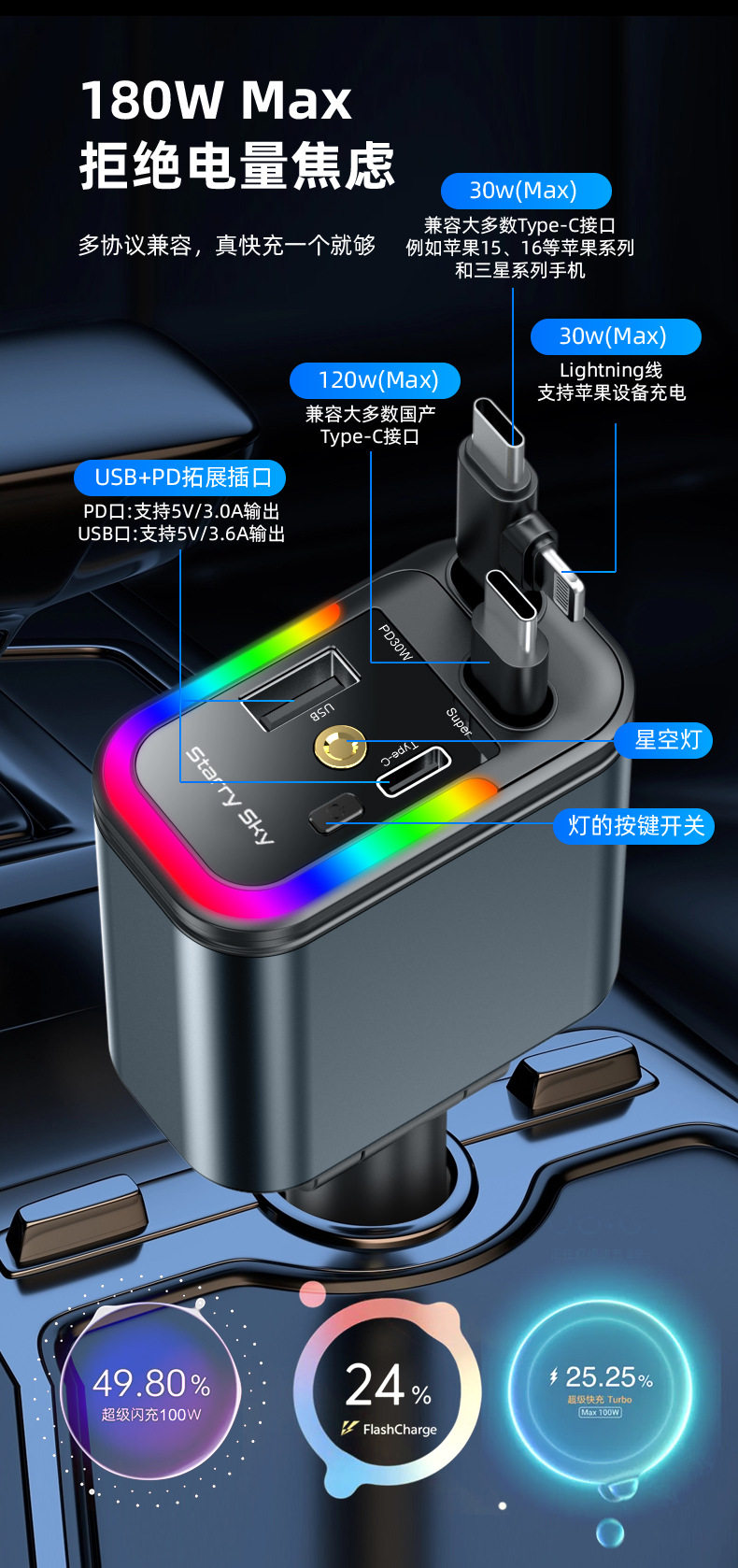 | Color | [starry sky top 240w] speed up 300% + comes with retractable cable + unlimited car models + intelligent temperature control type-c + universal for apple models,[starry sky top 120w] speed up 200% + comes with retractable cable + unlimited car models + intelligent temperature control type-c + universal for apple models,[double smoke hole 120w] speed up 200% + comes with retractable cable + unlimited car models + intelligent temperature control, universal for type-c models |