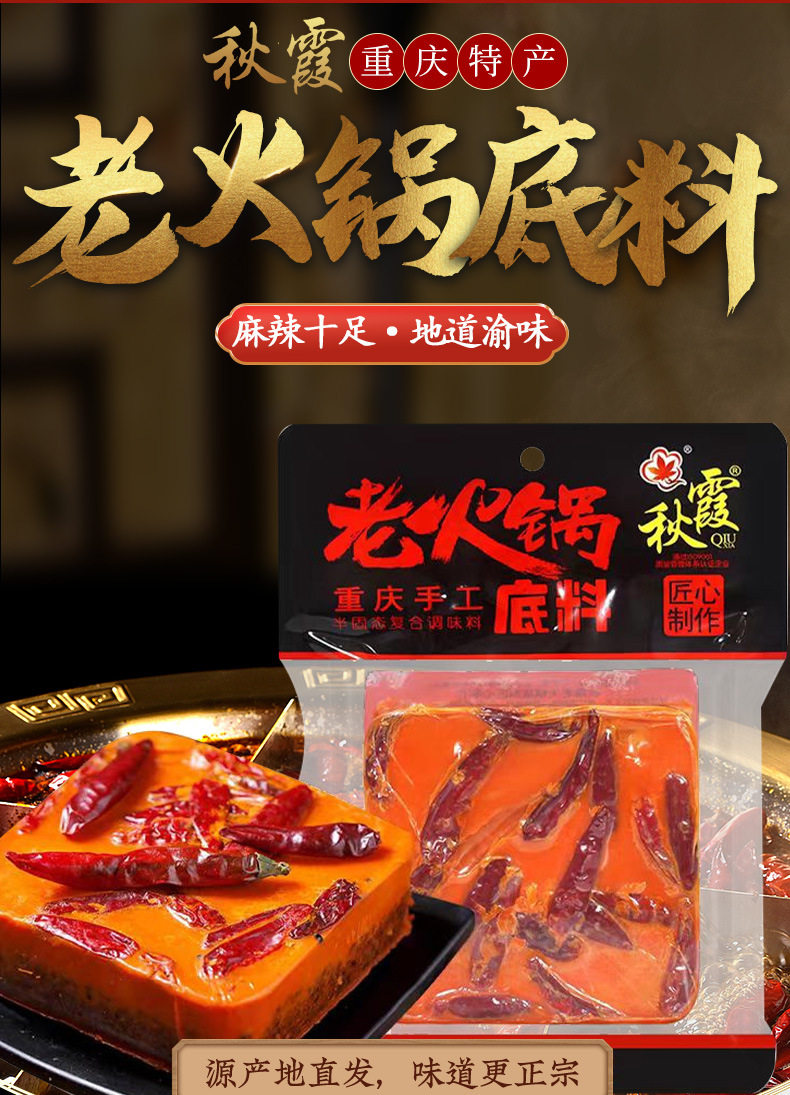 | Packaging specifications | 500g qiuxia cube hot pot base/bag,150g qiuxia roast chicken/bag,180g qiuxia spicy fish/bag,150g qiuxia red braised beef and mutton/bag,360g qiuxia spicy hot pot/bag,360g qiuxia yuanyang hot pot/bag,820g qiuxia 1991 commemorative base material,3.5kg qiuxia roast chicken seasoning/bucket |