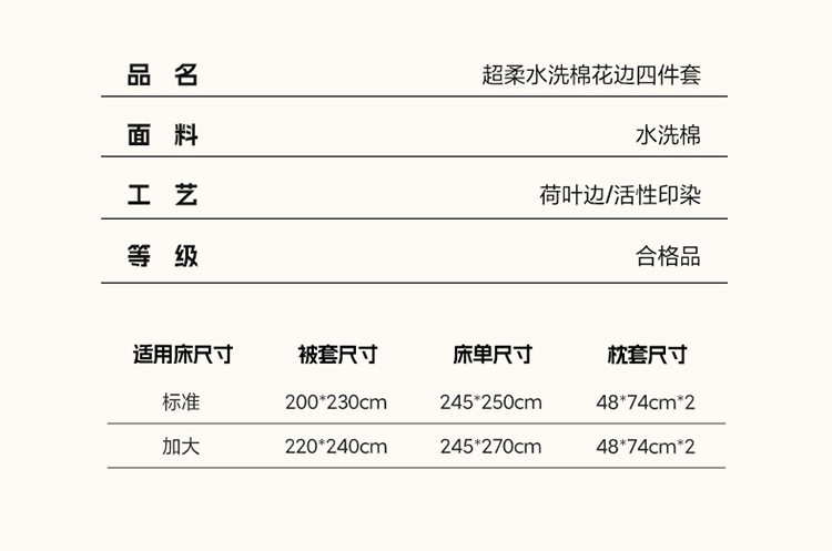 | Size Specifications | 1.2m bed/quilt cover 150*200cm/three-piece set,1.5m bed/quilt cover 200*230cm/four-piece set,1.8m bed/quilt cover 200*230cm/four-piece set,2.0m bed/quilt cover 220*240cm/four-piece set,1.5m bed/quilt cover 200*230cm/four-piece set [fitted sheet],1.8m bed/quilt cover 200*230cm/four-piece set [fitted sheet],2.0m bed/quilt cover 220*240cm/four-piece set [fitted sheet] |