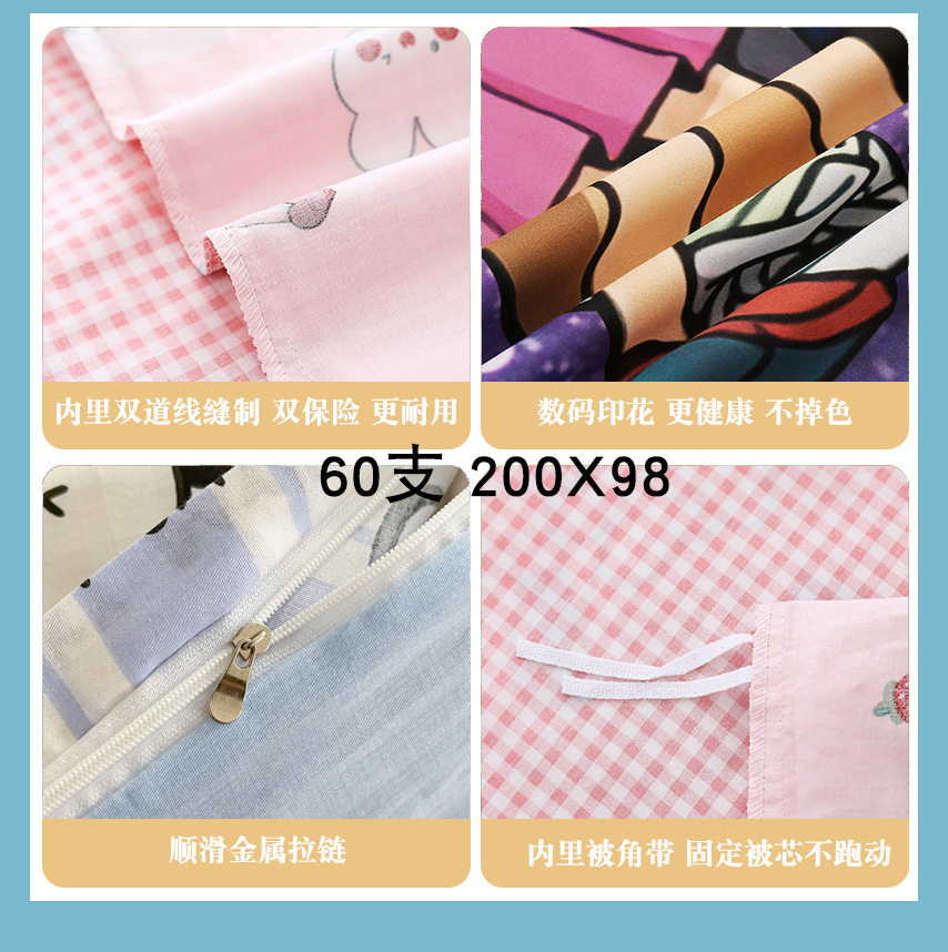 | Dimensions | 0.9m dormitory bed three-piece quilt cover 150*200,1.2m bed sheet three-piece quilt cover 150*200,1.5m bed sheet four-piece quilt cover 150*200,1.5m bed sheet four-piece quilt cover 180*220,1.5m bed double four-piece quilt cover 200*230,1.8m bed double four-piece quilt cover 200*230,2m bed plus double four-piece quilt cover 220*240,Customize other sizes, please contact customer service |