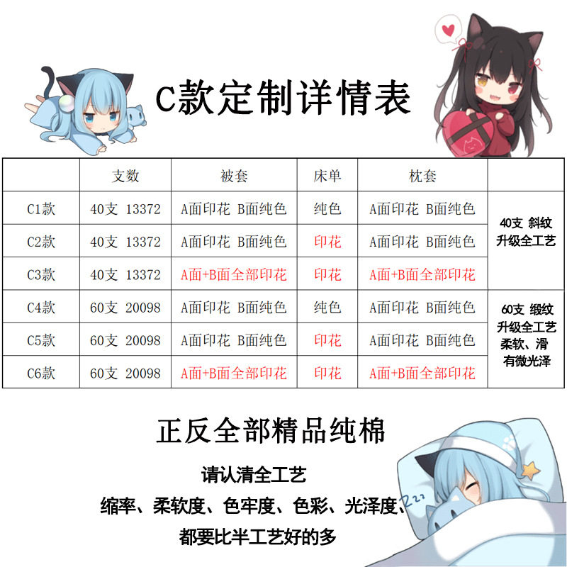| Flower type | C1 style 40 count twill pure cotton quilt cover pillowcase front printing,C2 style 40 count twill pure cotton quilt cover pillowcase front + sheet printing,C3 model 40 count twill pure cotton quilt cover pillowcase double-sided + bed sheet printing,C4 model 60 count satin cotton quilt cover pillowcase front punched,C5 60-count satin cotton quilt cover pillowcase front + sheet printing,C6 model 60 count satin cotton quilt cover pillowcase double-sided + sheet printing |