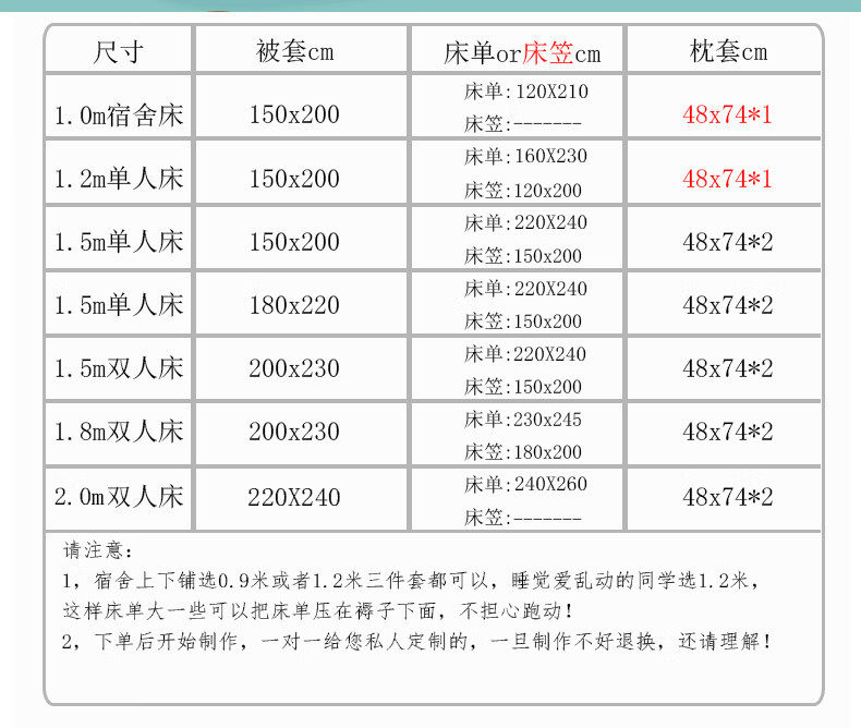 | Dimensions | 0.9m dormitory bed three-piece quilt cover 150*200,1.2m bed sheet three-piece quilt cover 150*200,1.5m bed sheet four-piece quilt cover 150*200,1.5m bed sheet four-piece quilt cover 180*220,1.5m bed double four-piece quilt cover 200*230,1.8m bed double four-piece quilt cover 200*230,2m bed plus double four-piece quilt cover 220*240,Customize other sizes, please contact customer service |