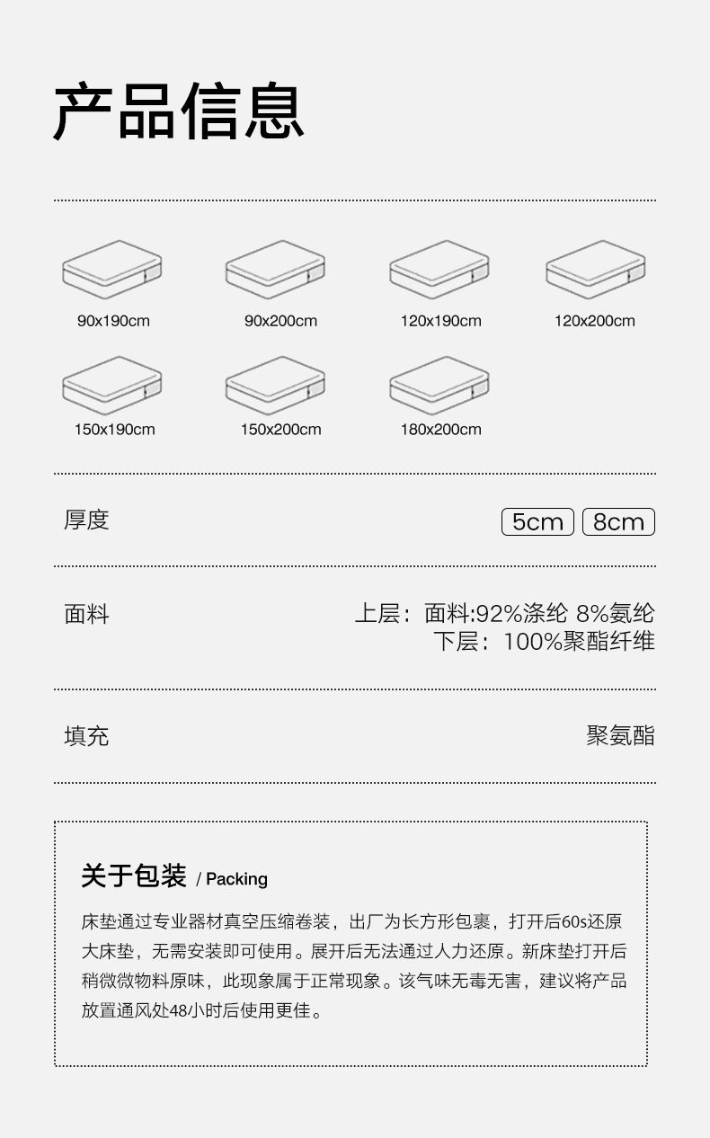 | Dimensions | 90x190cm-student bed [slow rebound memory foam, long sleep without collapse],90x200cm-student bed [slow rebound memory foam, long sleep without collapse],120x200cm-single bed [slow rebound memory foam, long sleep without collapse],150x190cm-double bed [slow rebound memory foam, long sleep without collapse],150x200cm-double bed [slow rebound memory foam, long sleep without collapse],180x200cm-double bed [slow rebound memory foam, long sleep without collapse],200x220cm-double bed [slow rebound memory foam, long sleep without collapse] |