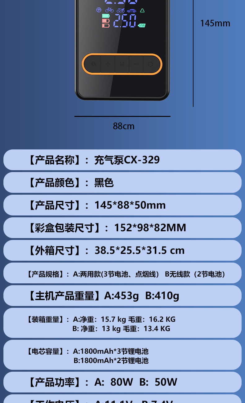 | Specification | 329 dual digital display + wireless model + power bank (4000 mah),329 dual digital display + car mount + wireless model + power bank (6000 mah),219 car wired model-glory silver,219 car wired model-cool black,219 wireless dual use model-glory silver,219 wireless dual-use model-cool black,229 wireless digital display model,319 starting power air pump all-in-one machine (8000mah),619 wireless power bank aluminum alloy gold 5000mah,619 wireless power bank aluminum alloy green 5000mah,718 starting power air pump all-in-one machine (6000mah) |