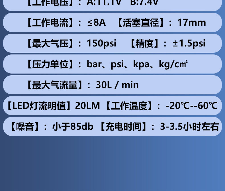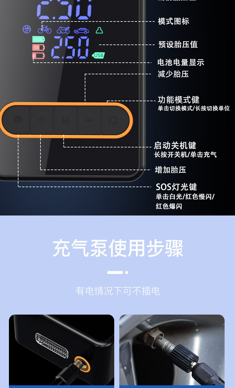 | Additional features | Lighting,Tire pressure gauge,Warning light,Usb charging |