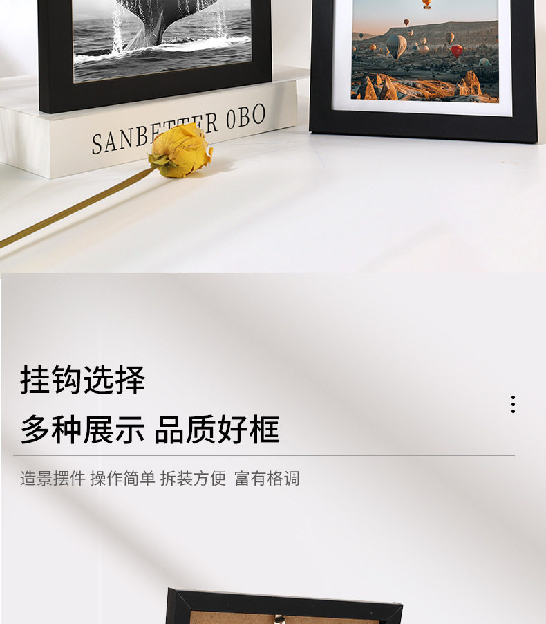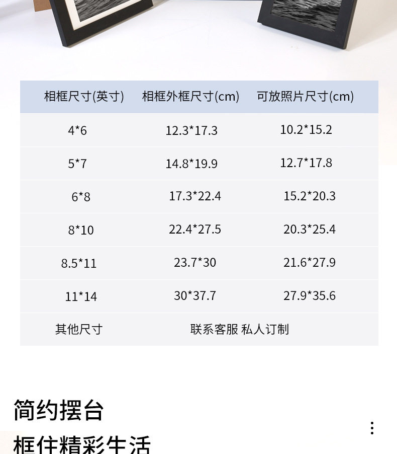 | Inner frame size | 4x6" (photo 10.2x15.2cm) can be placed or hung,5x7" (photo 12.7x17.8cm) can be placed or hung,6x8" (photo 15.2x20.3cm) can be placed or hung,8x10"(photo 20.3x25.4cm),11x14"(photo 27.9x35.6cm) can be hung,8.5x11" (photo 21.5x27.9cm) can be placed or hung,A4 (photo 21x29.7cm) can be placed or hung,A3 (photo 29.7*42cm) can be hung |