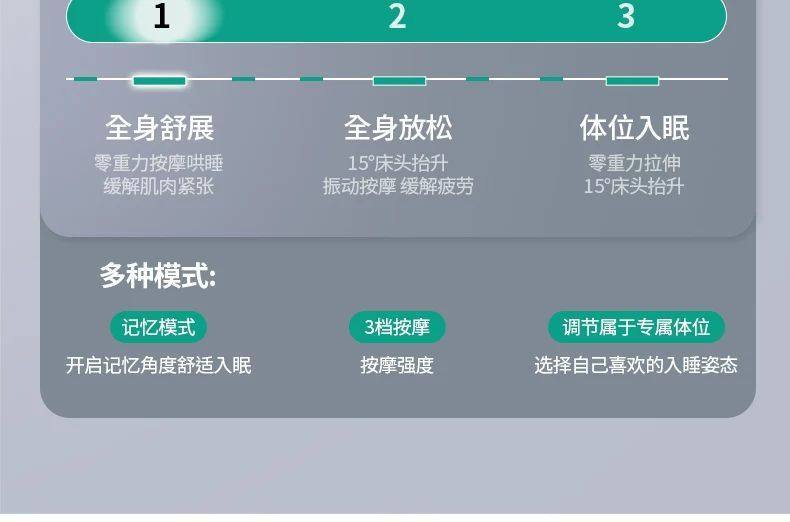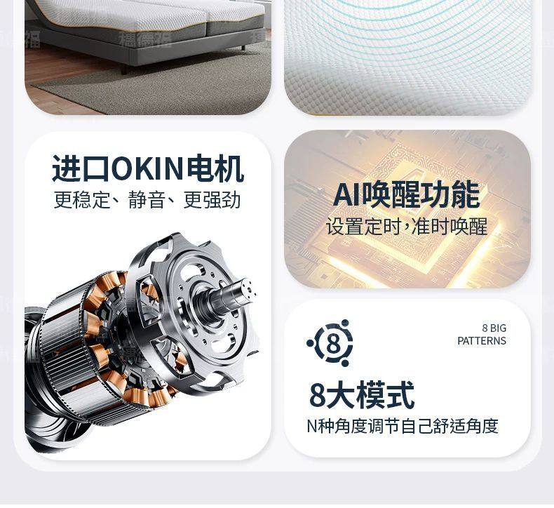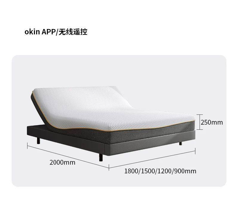 | Color | Okin dual motor (basic version) + wireless remote control + mini program,Okin dual motor + sleep monitoring + massage + voice anti-snoring,Three-motor semi-split (basic version) + wireless remote control + mini program,Three-motor semi-split + sleep monitoring + massage + voice anti-snoring,Four motors fully split (basic version) + wireless remote control + mini program,Four-motor fully split + sleep monitoring + massage + voice anti-snoring |