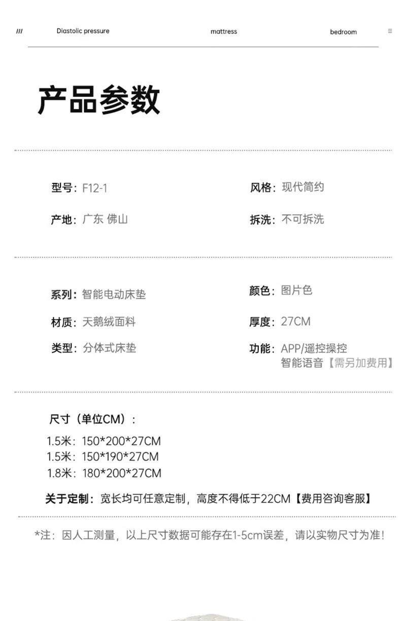 | Color | 【remote control + mini program】dual motor non-zoned smart mattress,[remote control + applet] three-motor semi-partition smart mattress,[remote control + applet] four-motor fully partitioned smart mattress |