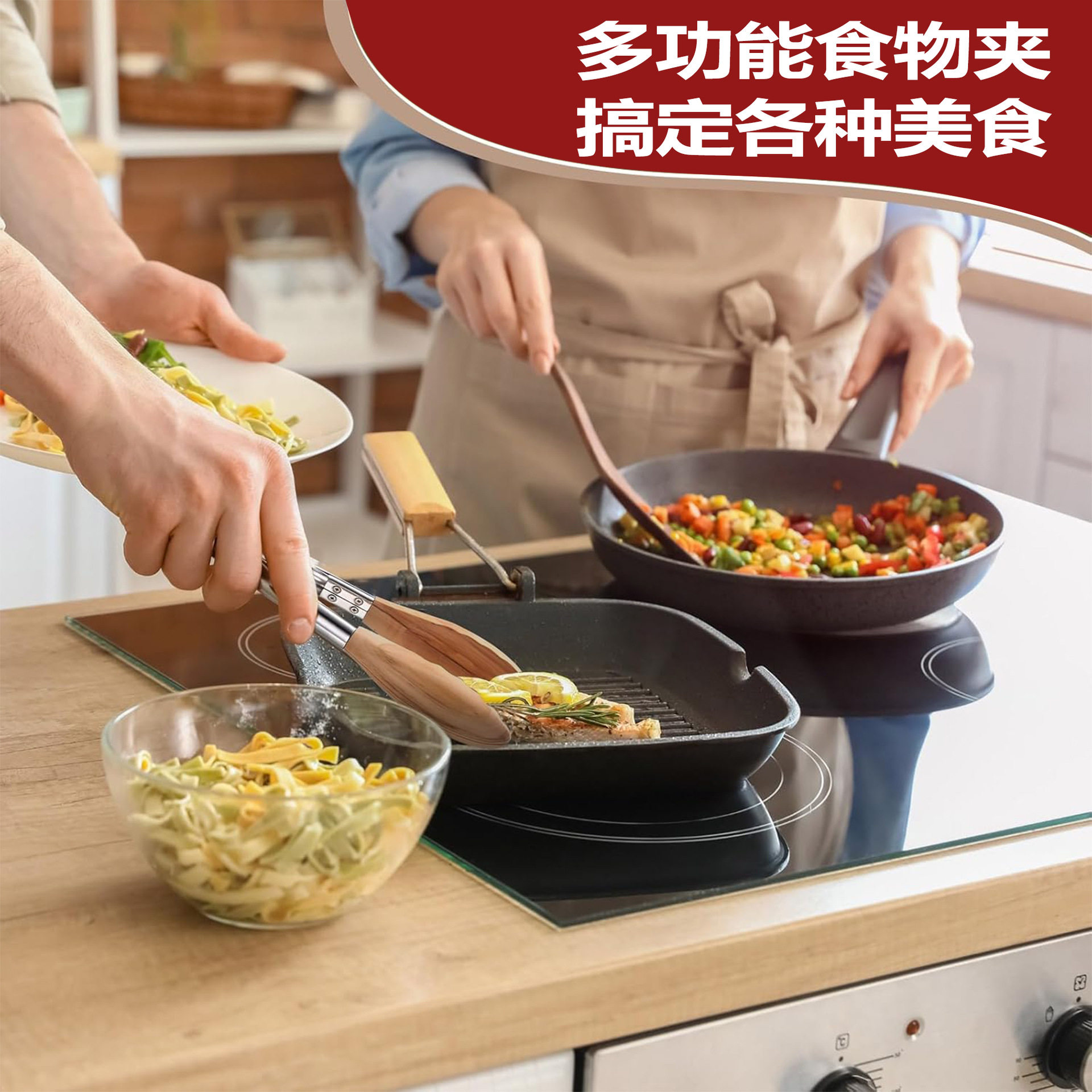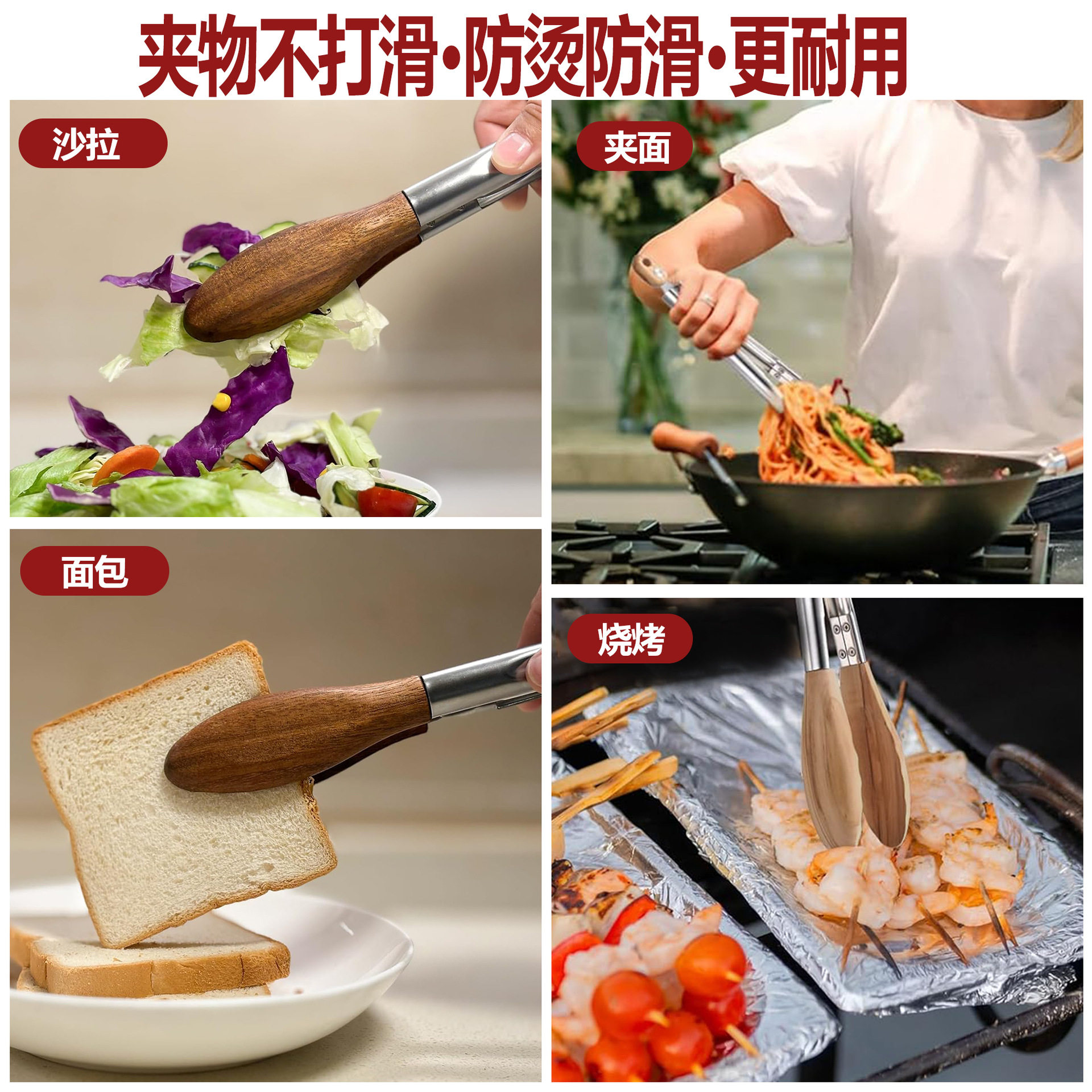 Stainless Steel Food Tongs 9inch 12inch Barbecue Tongs Buffet Barbecue Tongs Plum Blossom Head Walnut Wooden Food Tongs