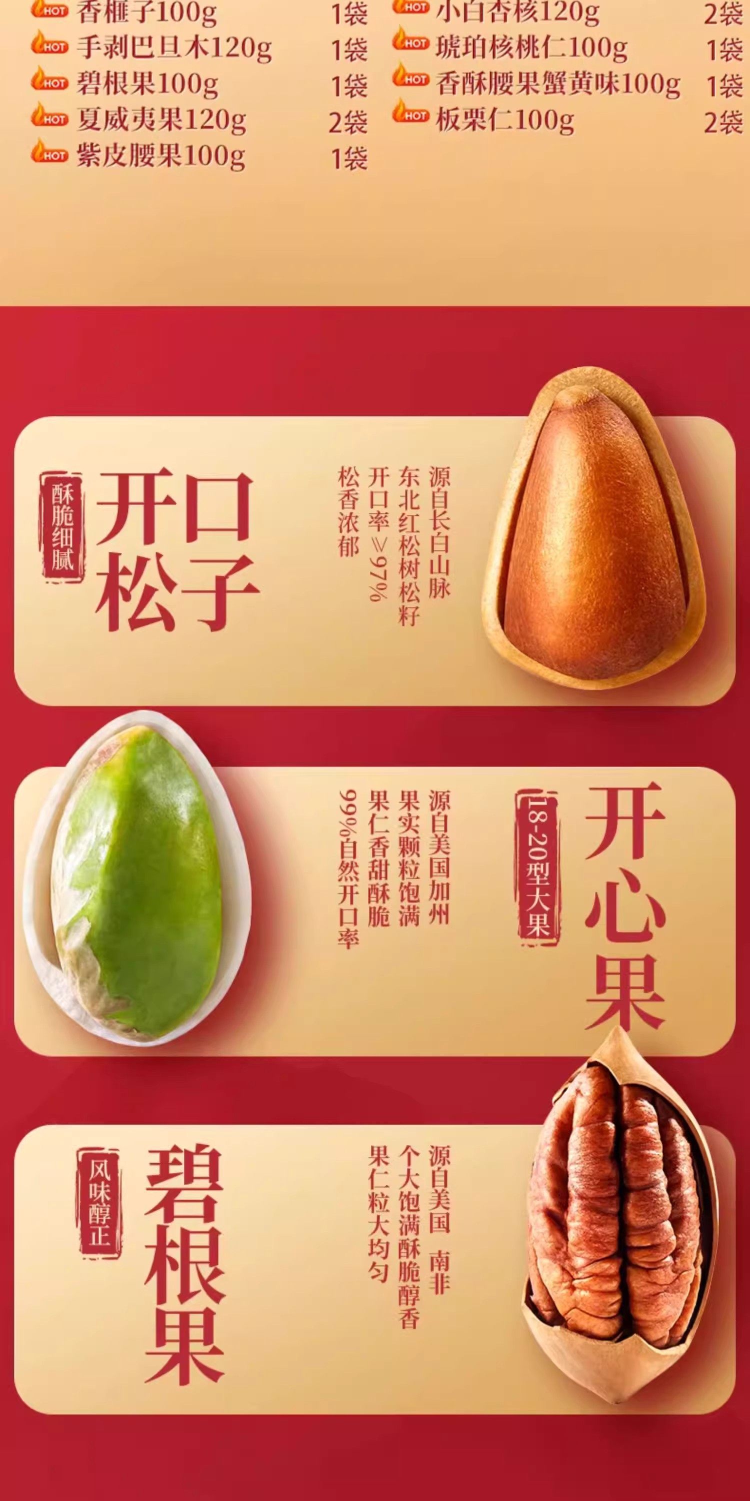 | Packaging specifications | [17 bags of pure nuts] dingjin b style 17 pieces/2000g,[13 bags of pure nuts] dingzi b style 1032g,[16 bags of pure nuts] dingzi c style 2016g,[15 bags of pure nuts] dingzi b style 1858g,【15 bags of pure nuts】gilded edition - 2328g gift box,【16 bags of pure nuts】premium luxury gift box,【20 bags】premium nut gift set - golden edition 2790g,【21 bags】premium nut gift set - diamond edition 2885g |