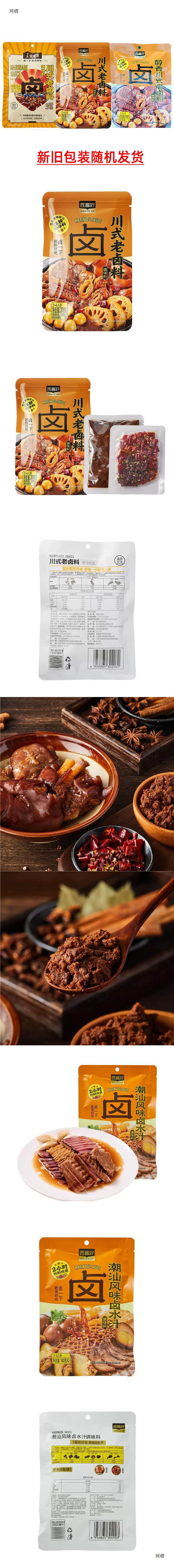 | Packaging specifications | Mellow sichuan style old marinade 208g,Mellow sichuan style old marinade 208g*2 bags,Fresh and fragrant chaoshan style brine juice 200g,Fresh and fragrant chaoshan flavor brine juice 200g*2 bags,[marinade + marinade] one bag each,Sichuan style marinade 1.04kg (5 bags of marinade included) |