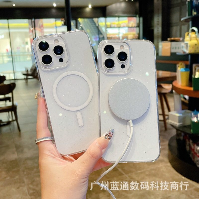 Transparent Glitter Magnetic Suction Suitable for Iphone16Promax Mobile Phone Case Apple 17 Non-Yellowing Pc15 Protective Cover 13
