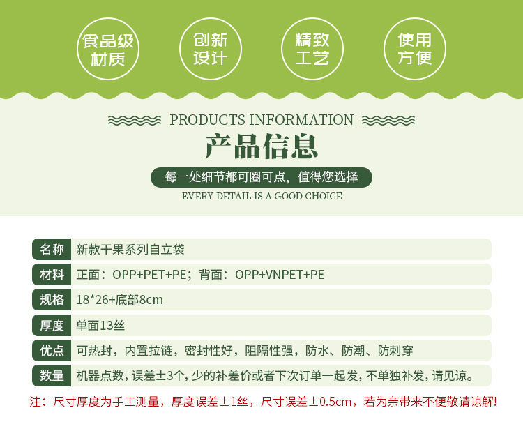 | Specifications and models | Dried fruit/red*100pcs/pack,Dried fruit/green*100pcs/pack,Almond wood*100pcs/pack,Pistachios*100pcs/pack,Pine nuts*100pcs/pack,Walnut kernels*100 pieces/pack,Cashew nuts*100pcs/pack,Hazelnuts*100pcs/pack,Pecans*100pcs/pack,Macadamia nuts*100pcs/pack |