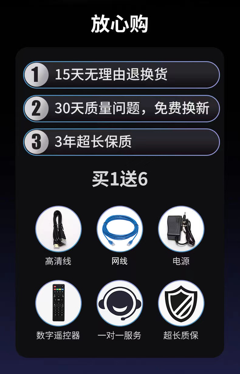 | Color | Network cable model [2k standard definition]-official standard configuration,Network cable model [4k hd + permanent vip] - official standard configuration,Network cable voice model [4k hd + voice remote control + permanent vip] - official standard configuration,Wireless model [4k hd + wifi + permanent vip] - official standard configuration,Wireless voice model [4k hd + wifi + voice remote control + permanent vip] - official standard configuration,Supreme model [32g memory + 5gwifi + voice + permanent vip] - official standard configuration |