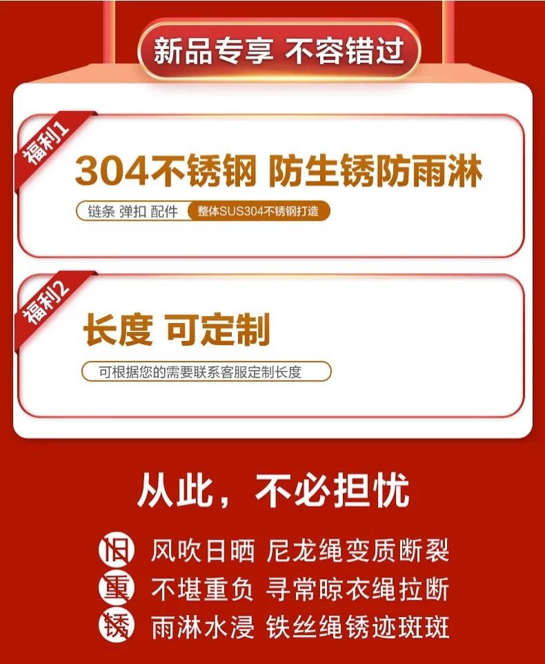 Color 304 clothes drying chain 4m + 2 snap buckles,304 clothes drying chain 3m + 2 snap buckles,304 clothes drying chain 5m + 2 snap buckles,304 clothes drying chain 6m + 2 snap buckles,304 clothes drying chain 7m + 2 snap buckles,304 clothes drying chain 8m + 2 snap buckles,304 clothes drying chain 9m + 2 snap buckles,304 clothes drying chain 10m + 2 snap buckles,304 clothes drying chain 12m + 2 snap buckles,304 clothes drying chain 15m + 2 snap buckles,304 clothes drying chain 20m + 2 snap buckles,304 clothes drying chain 25m + 2 snap buckles,304 clothes drying chain 30m + 2 snap buckles,304 clothes drying chain 1m + 2 snap buckles,304 clothes drying chain 1.5m + 2 snap buckles,304 clothes drying chain 2m + 2 snap buckles,304 clothes drying chain 4m +1 flower orchid +2 expansion hook,304 clothes drying chain 1m +1 flower orchid +2 expansion hook,304 clothes drying chain 1.5m +1 flower orchid +2 expansion hook,304 clothes drying chain 2m +1 flower orchid +2 expansion hook,304 clothes drying chain 3m +1 flower orchid +2 expansion hook,304 clothes drying chain 5m +1 flower orchid +2 expansion hook,304 clothes drying chain 6m +1 flower orchid +2 expansion hook,304 clothes drying chain 7m +1 flower orchid +2 expansion hook,304 clothes drying chain 8m +1 flower orchid +2 expansion hook,304 clothes drying chain 9m +1 flower orchid +2 expansion hook,304 clothes drying chain 10m +1 flower orchid +2 expansion hook,304 clothes drying chain 12m +1 flower orchid +2 expansion hook,304 clothes drying chain 15m +1 flower orchid +2 expansion hook,304 clothes drying chain 20m +1 flower orchid +2 expansion hook,304 clothes drying chain 25m +1 flower orchid +2 expansion hook,304 clothes drying chain 30m +1 flower orchid +2 expansion hook