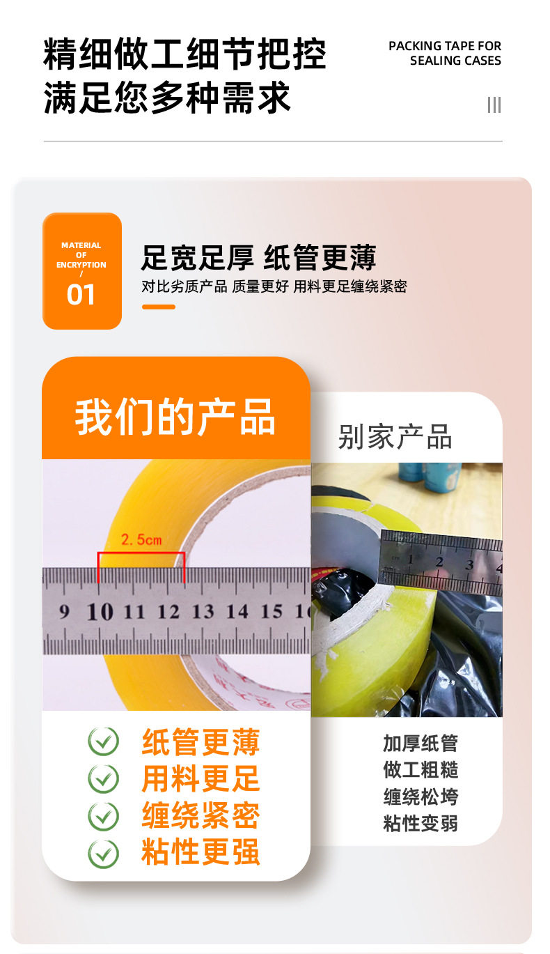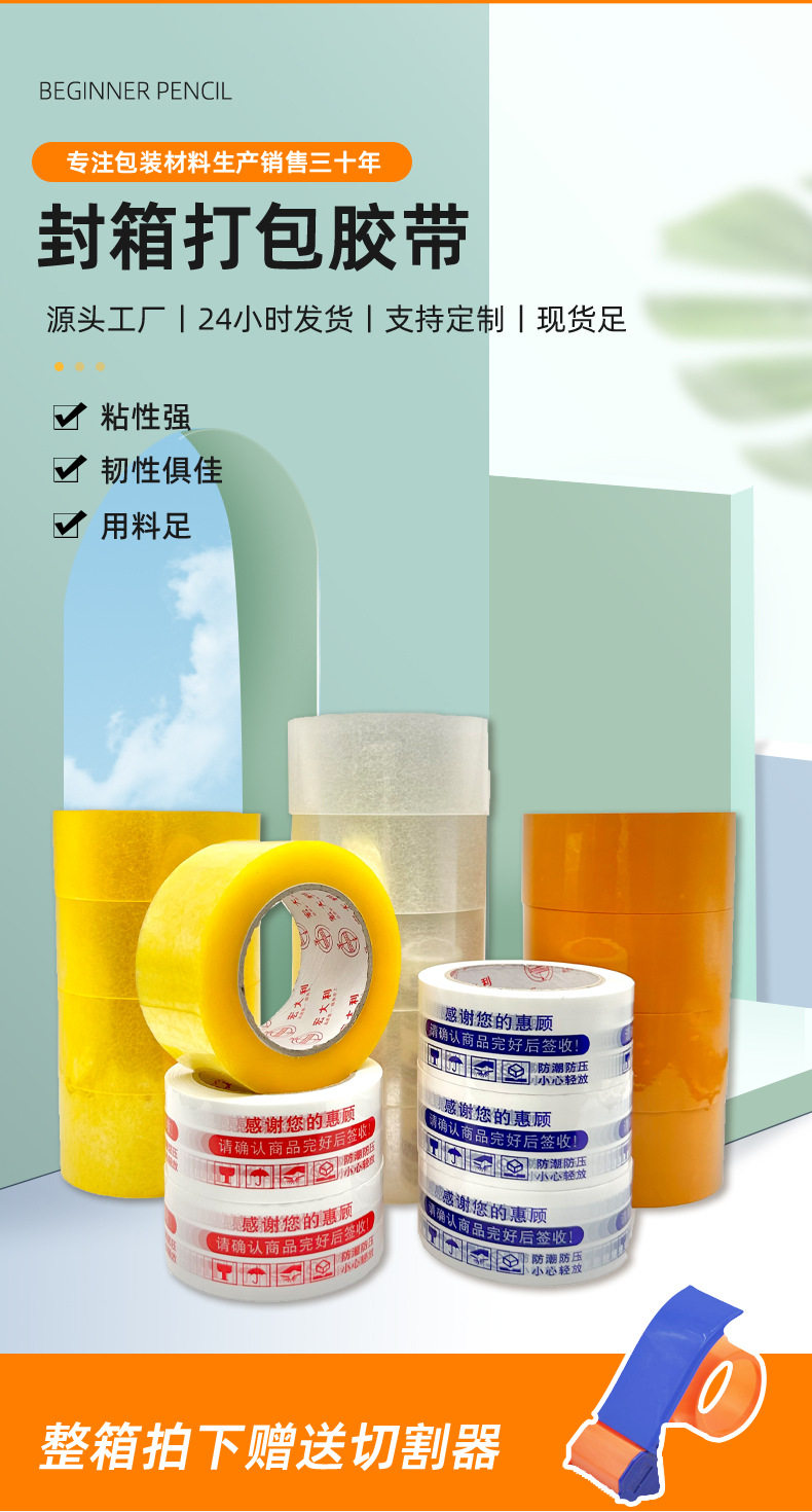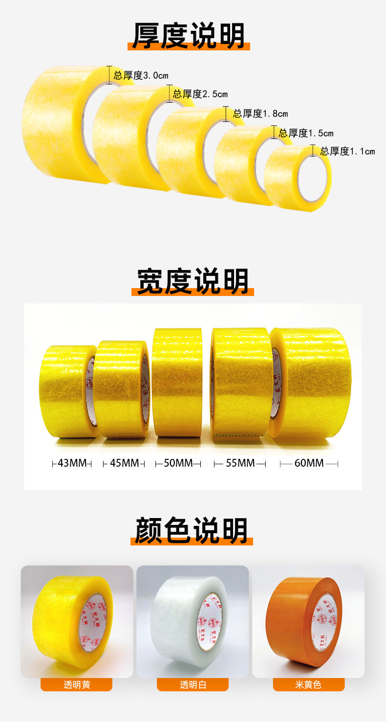 | Specifications and models | Transparent yellow; width 3.6*thickness 1.8cm [small box 32 rolls large box 96],Transparent yellow; width 4.3*thickness 1.5cm [small box 35 rolls large box 91],Transparent yellow; width 4.3*thickness 2.5cm [small box 28 rolls large box 63],Transparent yellow; width 4.5*thickness 1.1cm [small box 36 rolls, large box 56],Transparent yellow; width 4.5*thickness 1.5cm [small box 30 rolls, large box 78],Transparent yellow; width 4.5*thickness 1.8cm [small box 24 rolls large box 72],Transparent yellow; width 4.5*thickness 2.5cm [small box 24 rolls large box 54],Transparent yellow; width 4.5*thickness 3.0cm [small box 24 rolls large box 54],Transparent yellow; width 5.0*thickness 2.5cm [small box 24 rolls large box 54],Transparent yellow; width 5.5*thickness 1.8cm*110 [full box of 60 rolls],Transparent yellow; width 5.5*thickness 2.5cm*180 [full box of 45 rolls],Transparent yellow; width 5.5*thickness 3.0cm*250 [full box of 45 rolls],Transparent yellow; width 6.0*thickness 1.8cm [full box of 60 rolls],Transparent yellow; width 6.0*thickness 2.5cm [full box of 45 rolls],Transparent yellow; width 6.0*thickness 3.0cm [full box of 45 rolls],Transparent white; width 4.3*thickness 1.5cm [small box 35 rolls large box 91],Transparent white; width 4.3*thickness 2.5cm [small box 28 rolls large box 63],Transparent white; width 4.5*thickness 1.8cm [small box 24 rolls large box 72],Transparent white; width 4.5*thickness 2.5cm [small box 24 rolls, large box 54],Transparent white; width 4.5*thickness 3.0cm [small box 24 rolls large box 54],Transparent white; width 5.0*thickness 2.5cm [small box 24 rolls large box 54],Transparent white; width 5.5*thickness 1.8cm*110 [full box of 60 rolls],Transparent white; width 5.5*thickness 2.5cm*180 [full box of 45 rolls],Transparent white; width 5.5*thickness 3.0cm*250 [full box of 45 rolls],Transparent white; width 6.0*thickness 1.8cm [full box of 60 rolls],Transparent white; width 6.0*thickness 2.5cm [full box of 45 rolls],Transparent white; width 6.0*thickness 3.0cm [full box of 45 rolls],Beige; width 4.3*thickness 1.5cm [small box 35 rolls large box 91],Beige; width 4.3*thickness 2.5cm [small box 28 rolls large box 63],Beige; width 4.5*thickness 1.8cm [small box 24 rolls large box 72],Beige; width 4.5*thickness 2.5cm [small box 24 rolls large box 54],Beige; width 4.5*thickness 3.0cm [small box 24 rolls large box 54],Beige; width 5.0*thickness 2.5cm [small box 24 rolls large box 54],Beige; width 5.5*thickness 1.8cm*110 [full box of 60 rolls],Beige; width 5.5*thickness 2.5cm*180 [full box of 45 rolls],Beige; width 5.5*thickness 3.0cm*250 [full box of 45 rolls],Beige; width 6.0*thickness 1.8cm [full box of 60 rolls],Beige; width 6.0*thickness 2.5cm [full box of 45 rolls],Beige; width 6.0*thickness 3.0cm [full box of 45 rolls] |