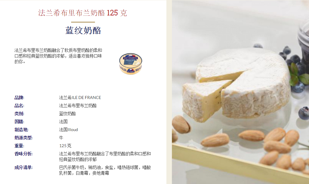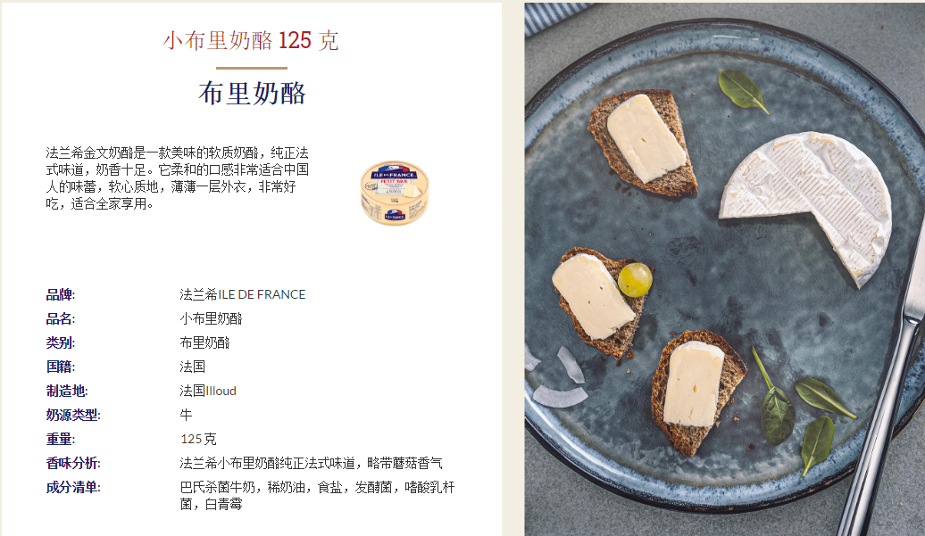 | Packaging specifications | Grant bronze 125g,"mini brie cheese 25g*3 pieces ""bag"".","mini brie cheese 25g*6 pieces ""bag"".",Mini brie 5 capsules,"franxi xiaojin 125g ""one pack""",Blanbury 125g 1 piece,One box each of xiaojinwen and xiaobri,3 flavors in a box,Virgil's mixed mini cheeses,Grantsbury 125g,Domei xianbu 1 box 125g |