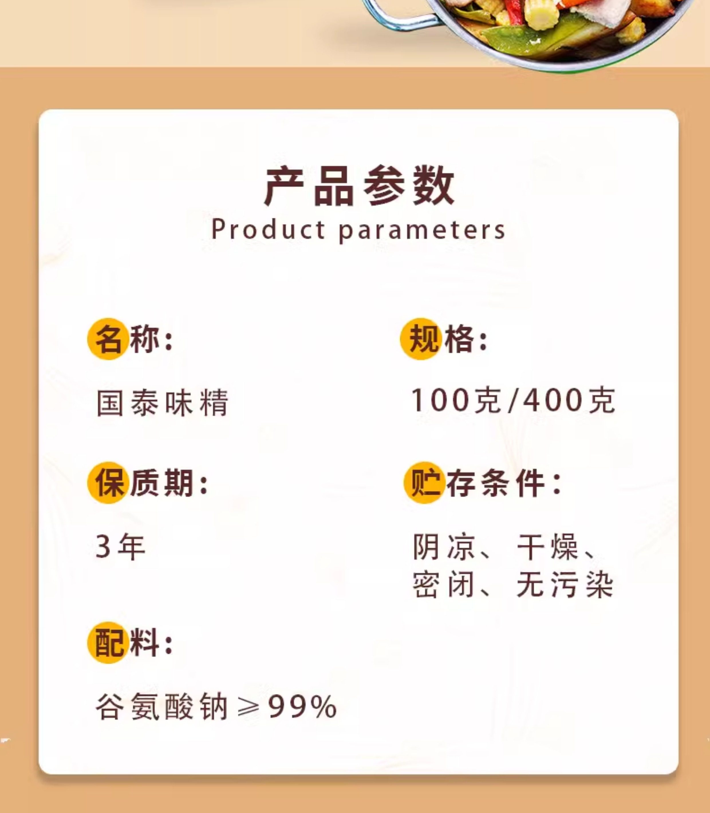 | Packaging specifications | Monosodium glutamate 400g*1 bag,Msg 400g*3 bags,Monosodium glutamate 400g*5 bags,Monosodium glutamate 400g*10 bags,Chicken essence 454g*1 bag |