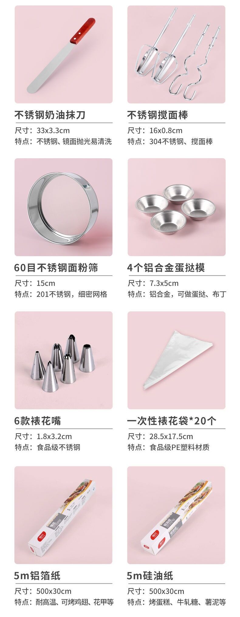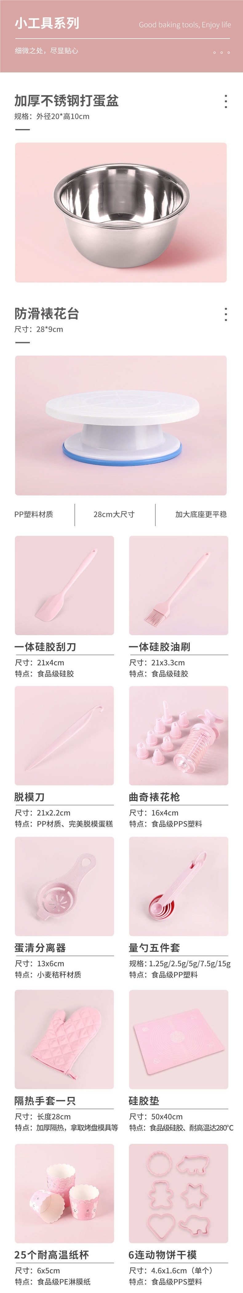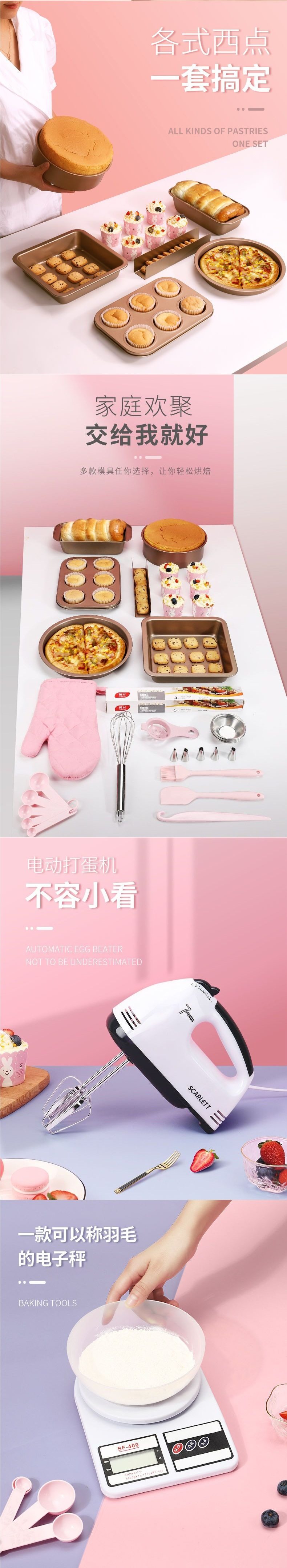 | Specification | Thickened non-stick three-piece set [4 gifts included],Family starter set egg beater + scale [4 gifts],Thickened non-stick 5-piece set [4 gifts included],Thickened non-stick 5-piece set + basin + sieve [4 gifts included],Thickened non-stick 6-piece set + basin + sieve [4 gifts included],Thickened non-stick 4-piece set + basin + sieve [4 gifts included],Special package + electronic scale [4 gifts],Special electrical tools set for home [4 gifts free],Family starter set includes egg beater + scale,Home novice set includes egg beater + scale,Newbie in the family includes egg beater + scale + decorating table,Home baking tools set without appliances,Home baking tools + electric egg beater,Home baking tools + electronic scale,Home baking tools + electric egg beater + scale,Complete set for home enjoyment + egg beater + scale + decorating table,Home starter 6inch egg beater + scale [free 4 layers,Small oven home set [4 gifts included],Small oven set + egg beater + scale [4 gifts] |