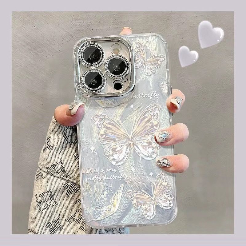 Silver Butterfly Suitable for Apple 16Promax Mobile Phone Case Female Iphone15 Lens Film All-Inclusive 14Pro Feather Yarn