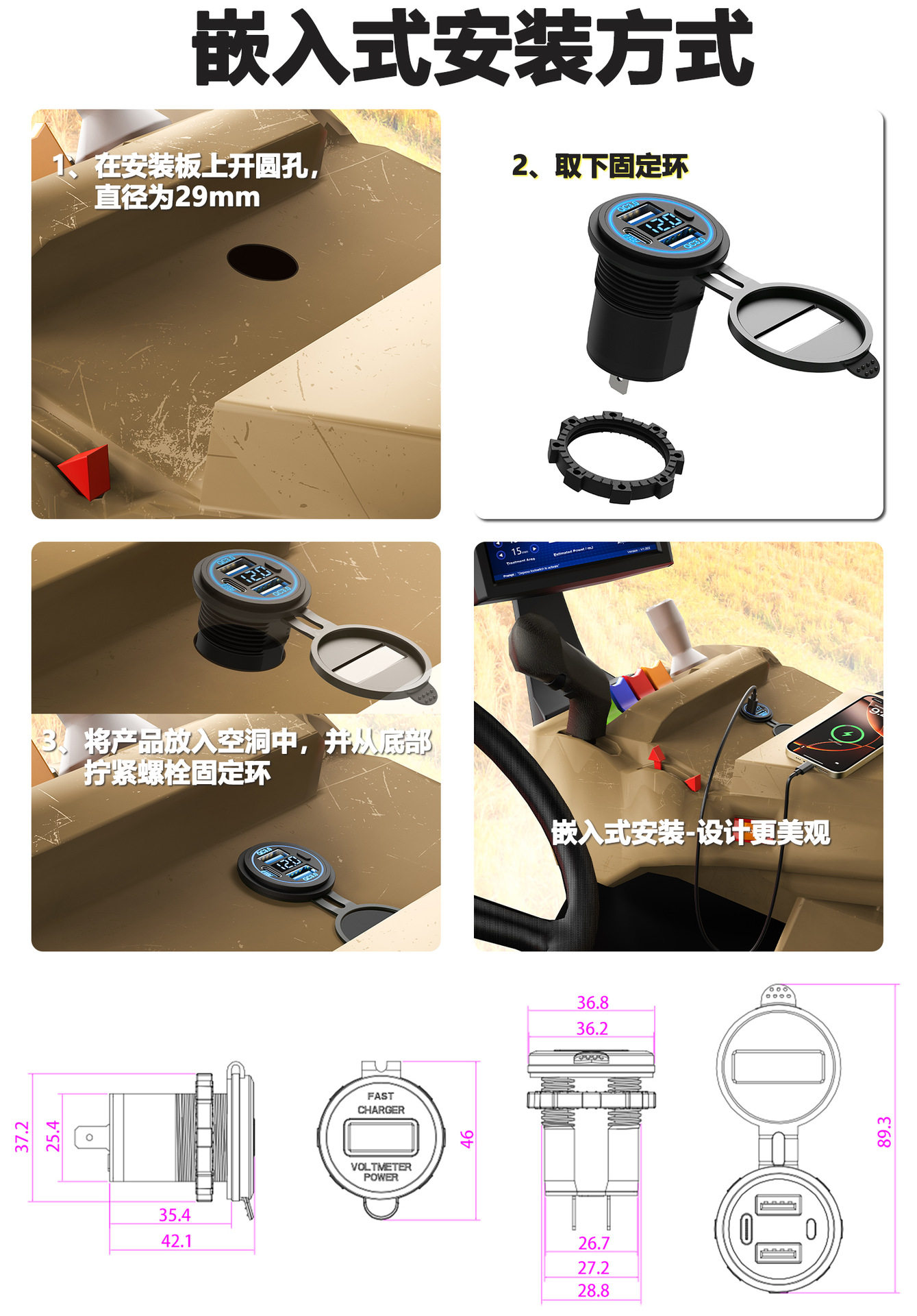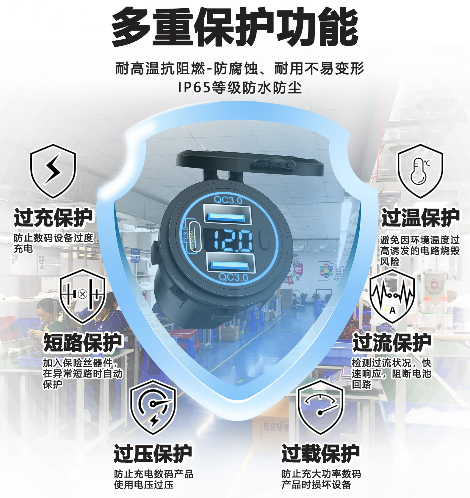 Three-Port Fast Charging Modified Car Charger Waterproof Digital Display with Switch for Ships, Buses, Rvs, and Vehicles