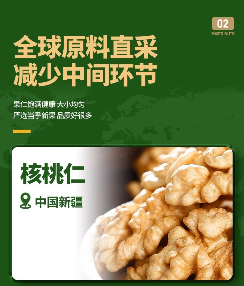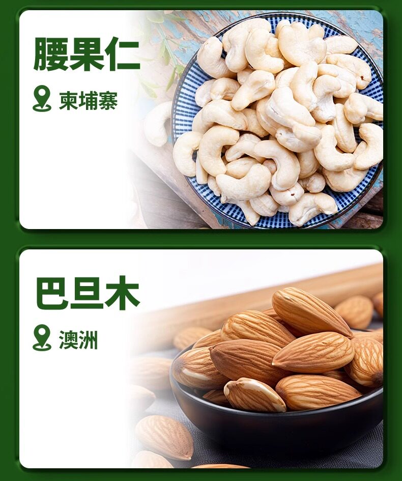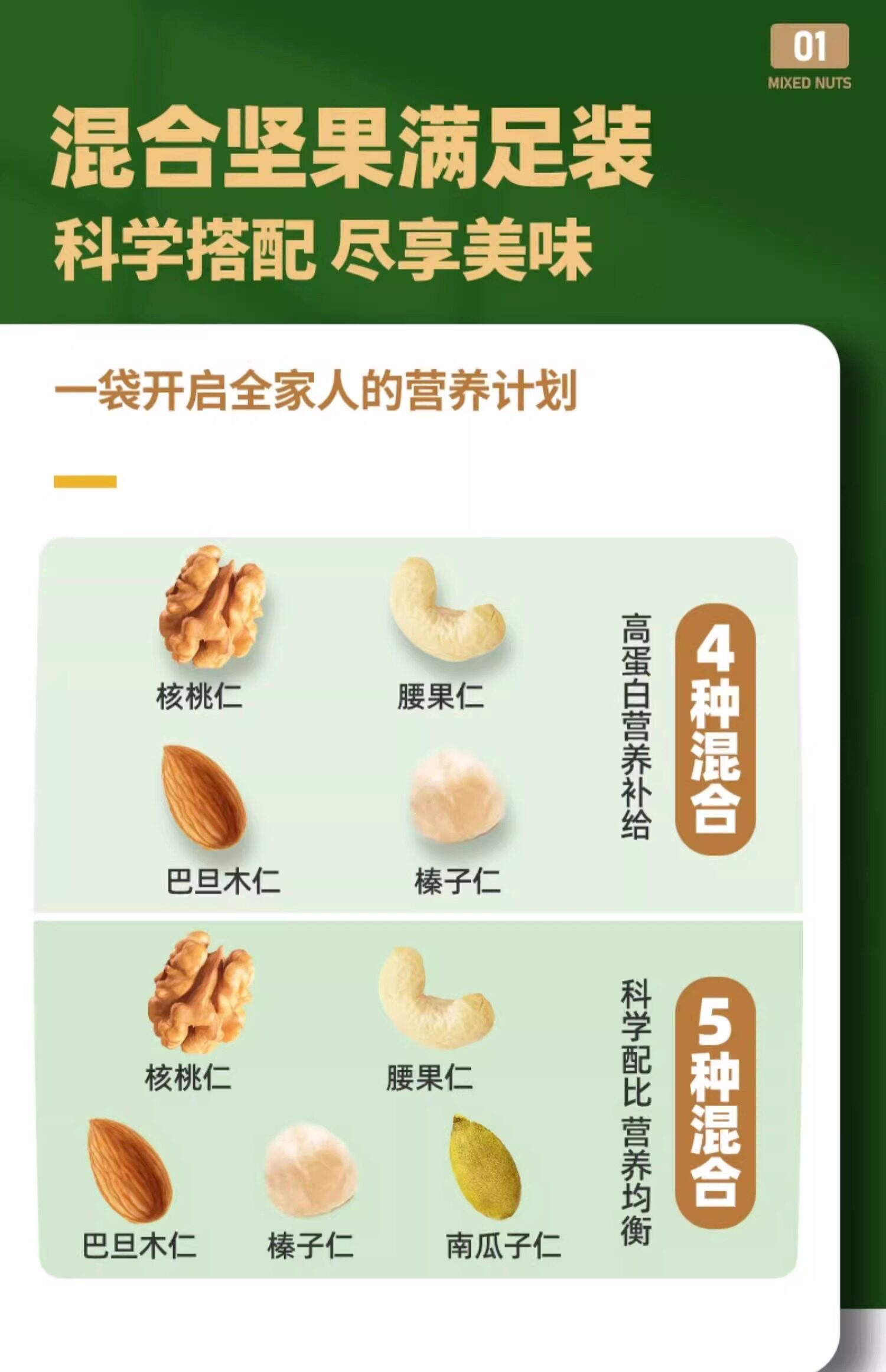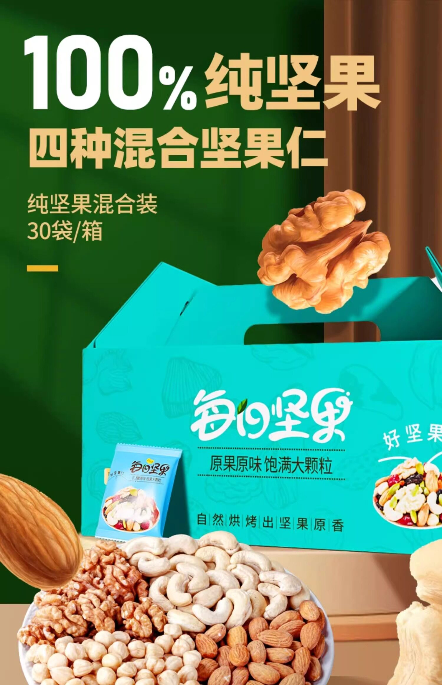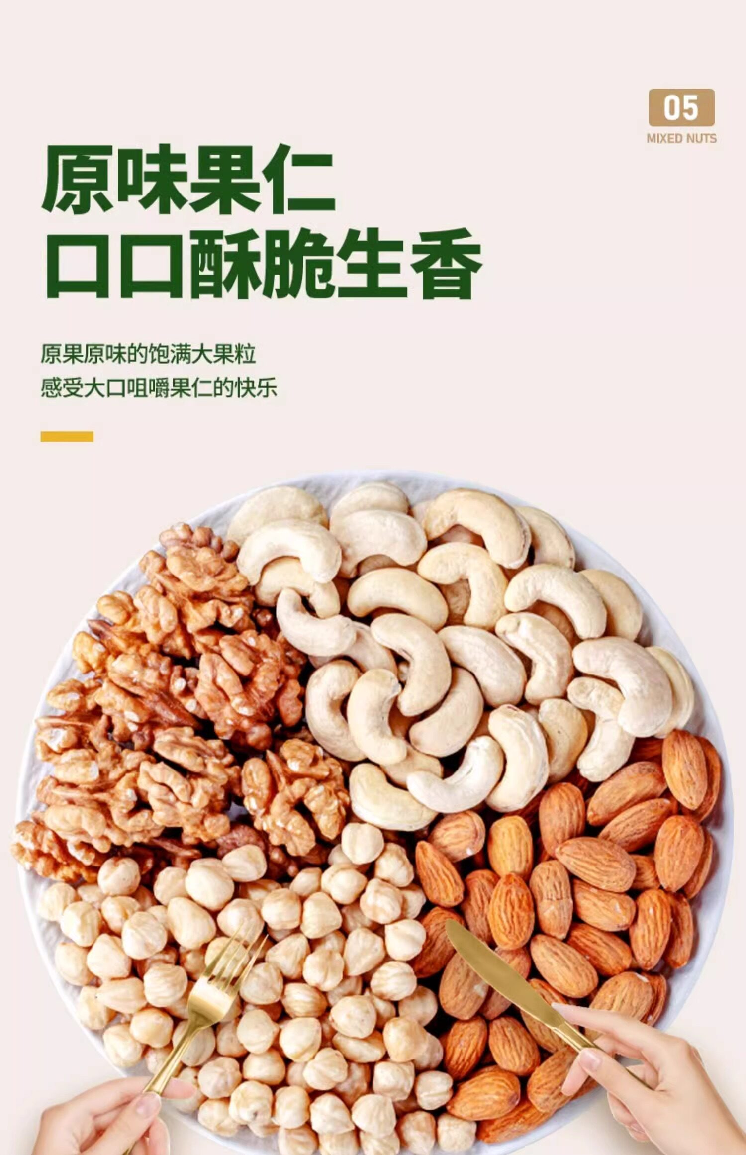 | Taste | [whole nut ratio] 15 packs of 4 types of pure nut kernels, get 15 packs free (30 packs sent, total 600g),,[whole nut ratio] 15 packs of 5 types of pure nut kernels, get 15 packs free (30 packs sent, total 600g),,[combined model] 15 packs of 4 types of pure nuts + 15 packs of 5 types of pure nuts,,[combined model] 30 packs of 4 types of pure nuts + 30 packs of 5 types of pure nuts,,Affordable model [whole nut ratio] 60 packs of 4 types of pure nut kernels (1200g in total),,Affordable model [whole nut ratio] 60 packs of 5 types of pure nut kernels (1200g in total),,Recommended model [whole nut ratio] 40 packs of 4 types of pure nut kernels (800g in total),,Recommended model [whole nut ratio] 40 packs of 5 types of pure nut kernels (800g in total),,Mass sales package [total nut ratio] 100 packs of 4 types of pure nut kernels (2000g in total),,Mass sales package [total nut ratio] 100 packs of 5 types of pure nut kernels (2000g in total),,Taster pack [whole nut ratio] 15 packs of 4 types of pure nut kernels (300g in total),,Taster pack [whole nut ratio] 15 packs of 5 types of pure nut kernels (300g in total),,Large can [whole nut ratio] 5 kinds of pure nut kernels 500g*1 can,,Style [whole nut ratio] 4 kinds of nut gift box style 600g*1 box,,Style [whole nut ratio] 5 kinds of nut gift box style 600g*1 box,,More cost-effective [combined model] 4 types of nut gift boxes + 5 types of nut gift boxes, 1 box each,,Affordable model [full nut ratio] 4 kinds of nut gift box model 600g*2 boxes,,Affordable model [full nut ratio] 5 kinds of nuts gift box 600g*2 boxes,,[10 packs in total] 8 kinds of daily nut small packages (including dried fruits), less nuts,,[10 packs in total] 8 small packages of daily nuts (including dried fruits) with less nuts* |