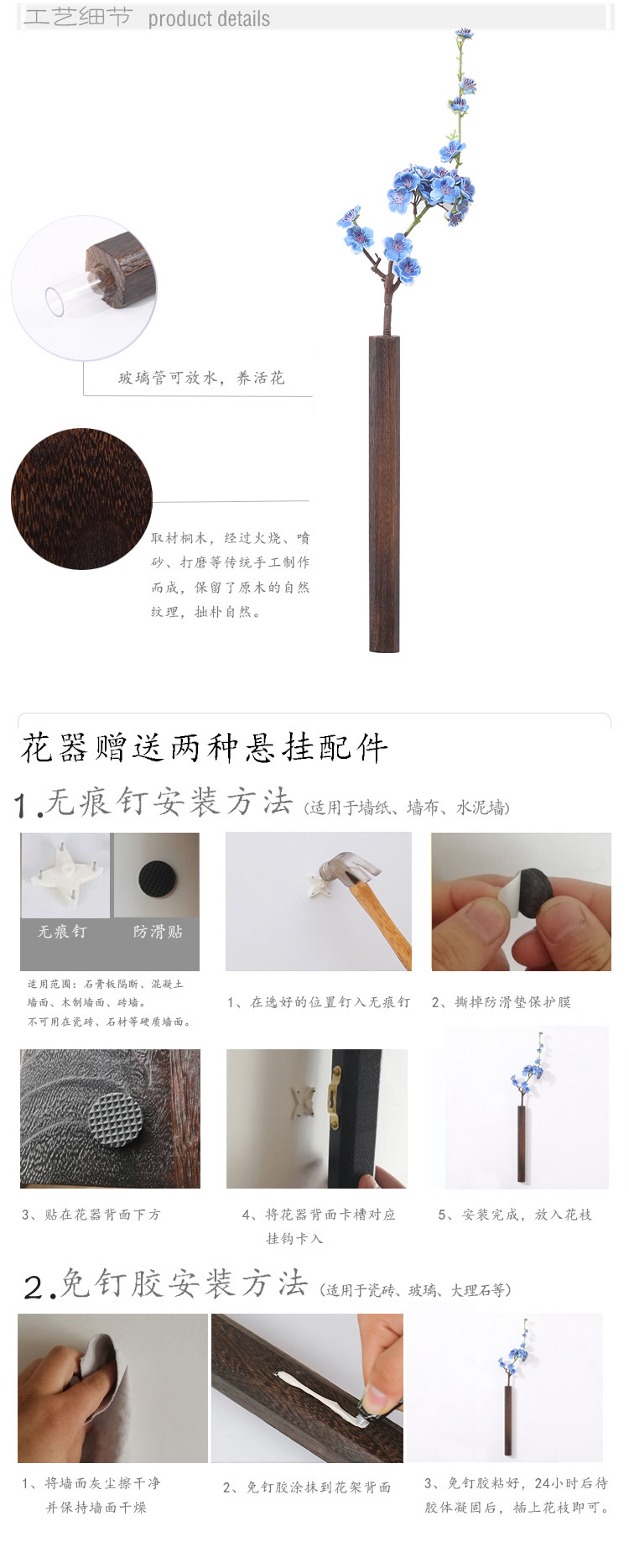Solid Paulownia Wood Wall-Mounted Flower Arrangement Japanese Creative Hydroponic Flower Holder Living Room Art Dried Flower Ornament Flower Ginger Tea