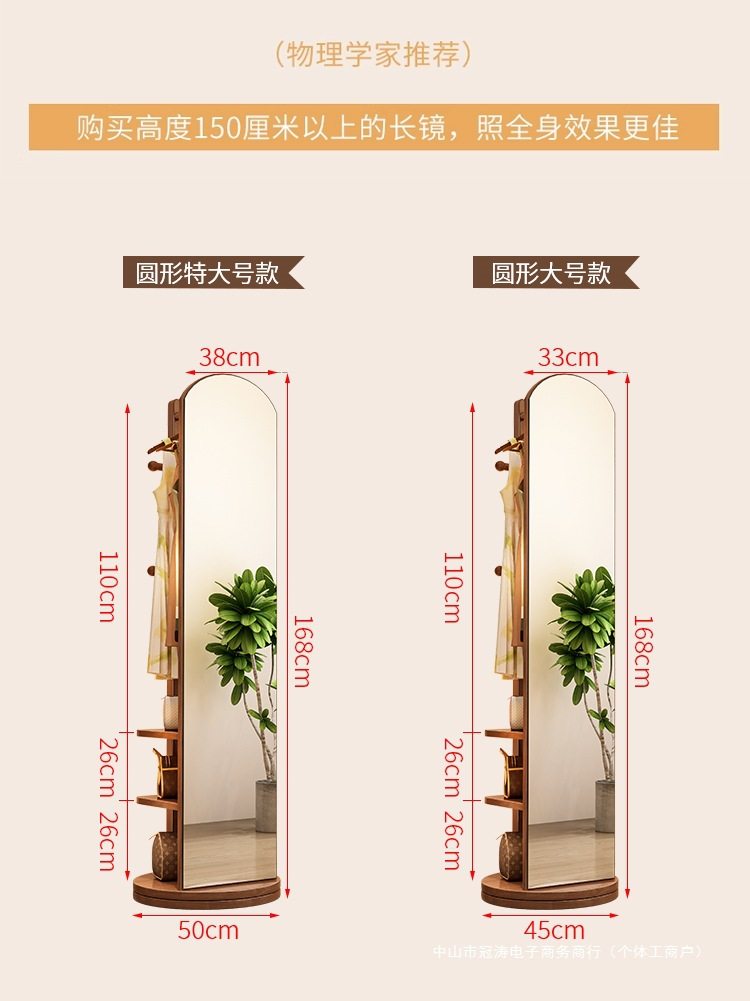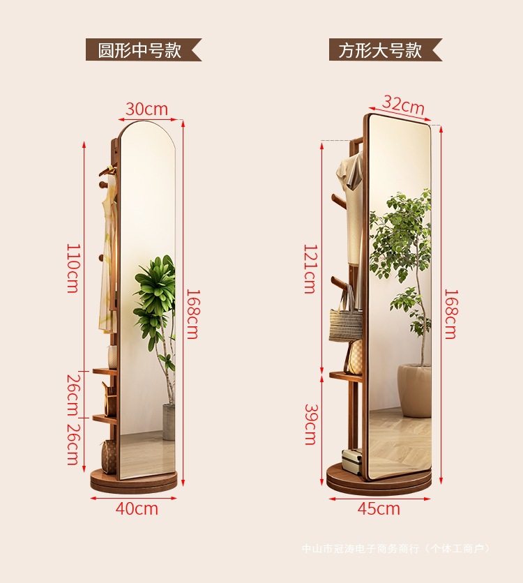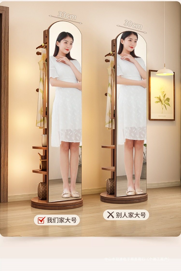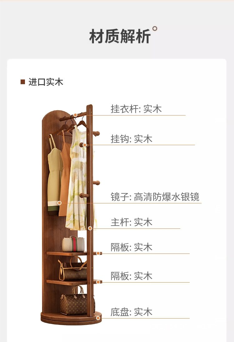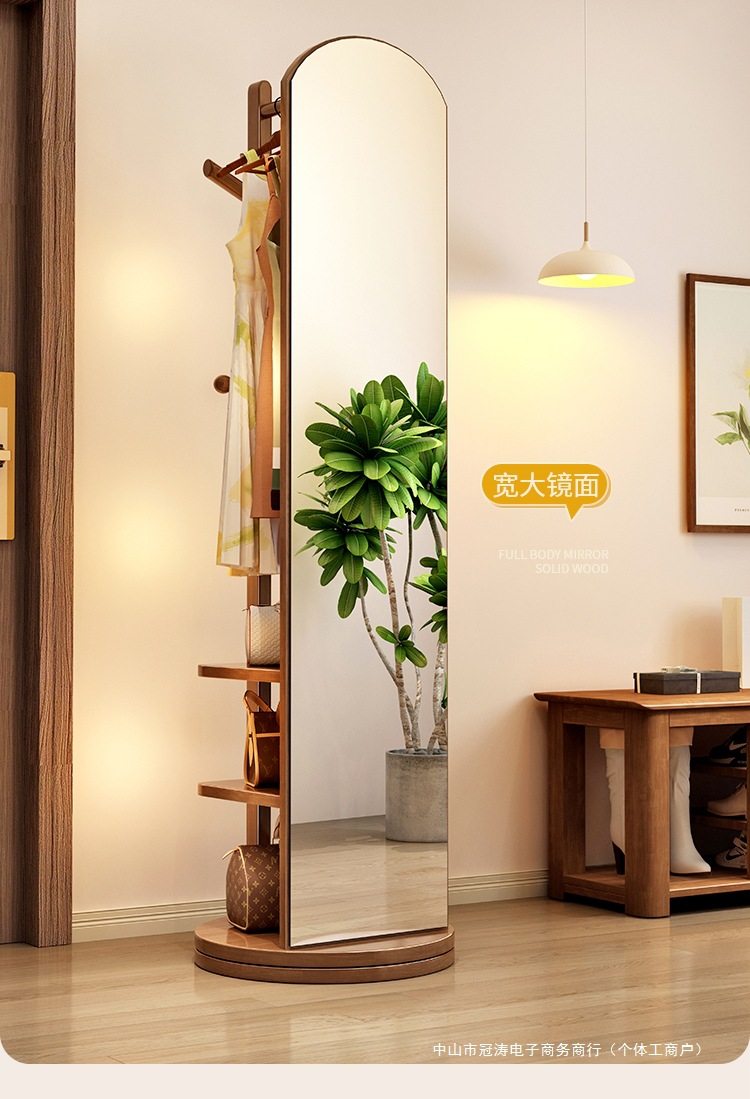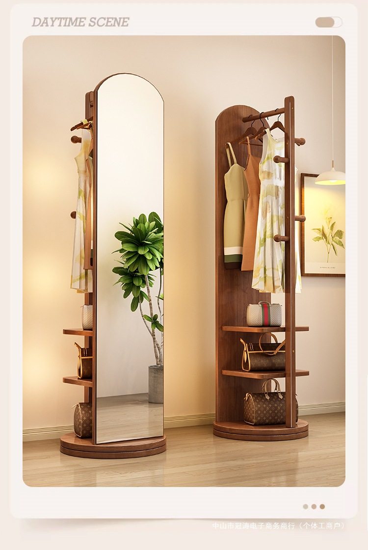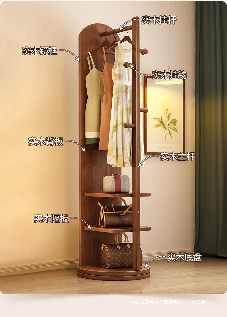 Solid Wood Clothes Hanger Bedroom Floor-Standing Coat Rack with Mirror Integrated Living Room Home Removable Multi-Functional Storage Rack