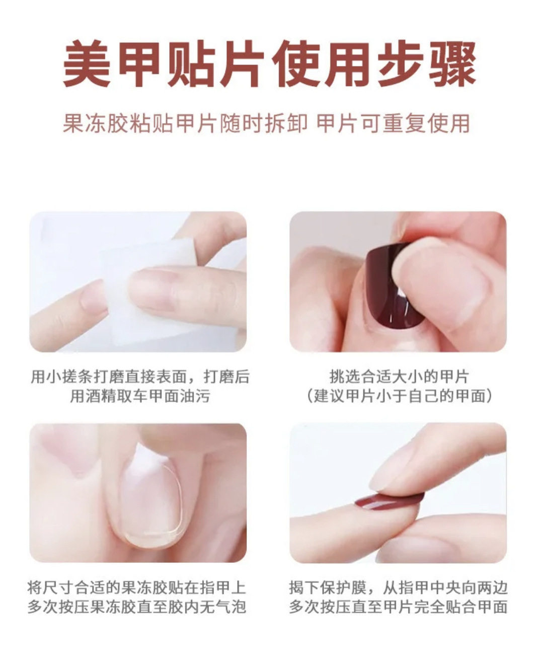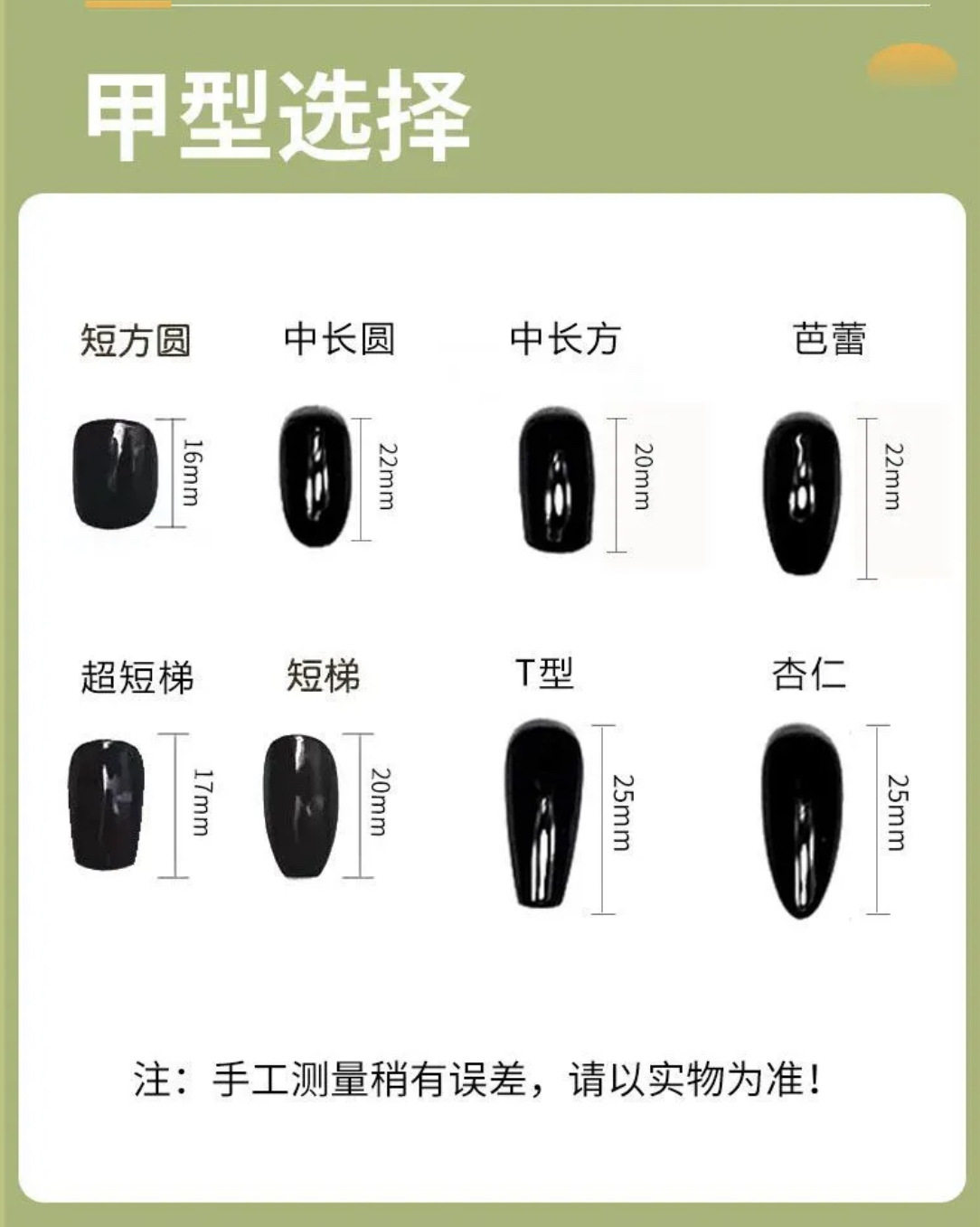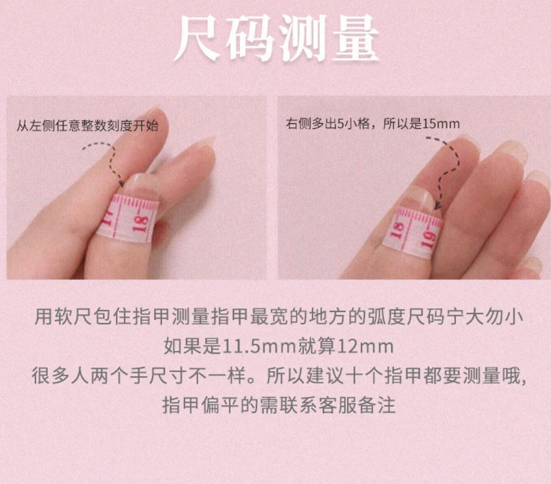 | Color Category | Xs (hands are particularly small/small people/nail beds are particularly small),S (regular size/hands not too big or too small/purchased for the first time),M (meat hand/hand is too large/nail bed is wide and flat to choose),L (niche style choice, the nail bed is particularly large) |