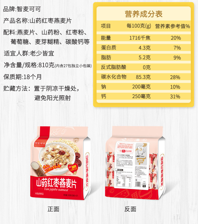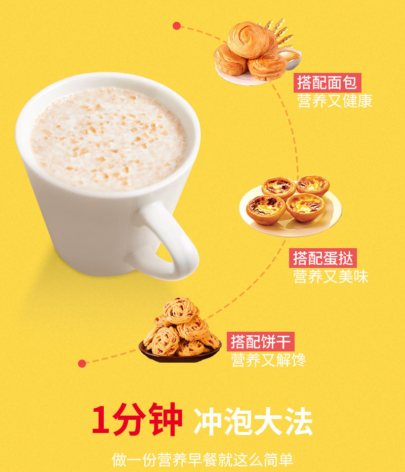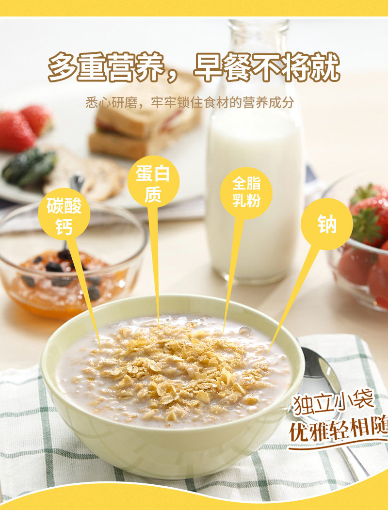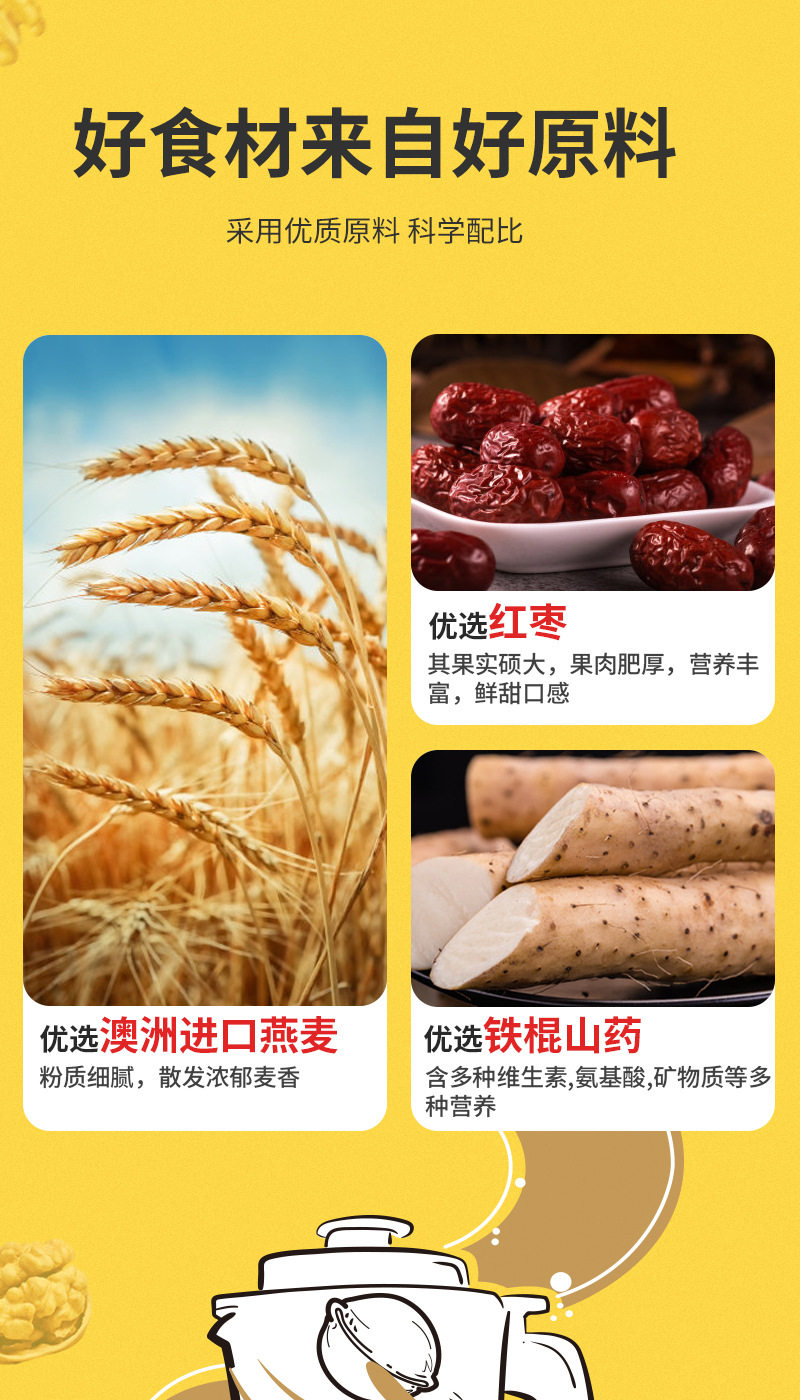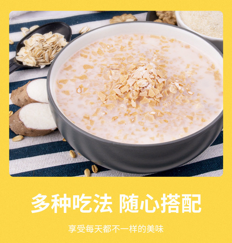 | Packaging specifications | Yam and red date oatmeal 810g,Yam and walnut oatmeal 810g,Milk high calcium oatmeal 810g,High calcium oatmeal for middle-aged and elderly people 810g,Xylitol black sesame oatmeal 810g sucrose-free,Yam and pueraria oatmeal 810g,Milk high calcium soy milk powder 810g,Middle-aged and elderly soy milk powder 810g sucrose-free |