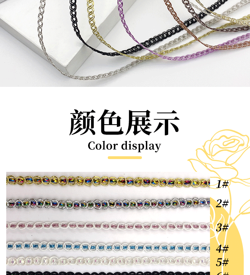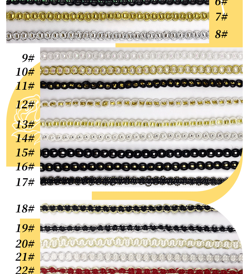 Specifications and models 108-1 golden colorful (5mm),108-2 silver colorful (5mm),108-3 pink (5mm),108-4 blue (5mm),108-5 white colorful (5mm),108-6 black colorful (5mm),108-7 gold (5mm),108-8 silver (5mm),108-9 white edge colorful (5mm),108-10 gold edge colorful (5mm),108-11 black edge gold wire (5mm),108-12 white edge gold wire (5mm),108-13 platinum (5mm),108-14 silver (5mm),108-15 black silver (5mm),108-16 black gold (5mm),108-17 black gold wire (5mm),108-18 black gold edge (5mm),108-19 black silver edge (5mm),108-20 white gold edge (5mm),108-21 white silver edge (5mm),108-22 red gold edge (5mm),108-23 platinum (3mm),108- 24m gold wire (5mm),108-25 black (5mm),108-26 silver white silk (5mm),108-27 golden white silk (5mm),108-28 colorful white silk (5mm),108-29 gold red bottom (5mm),108-30 gold white background (5mm),108-31 gold black bottom (5mm),108-32 white black bottom (5mm),108-33 white (5mm),108-34 light apricot (5mm),108- 35m white (5mm),108-36 apricot (5mm),108-37 brown (3mm),108-38 white (3mm),108-39 silver (3mm),108-40 light gold (3mm),108-41 gold (3mm),108-42 purple (3mm),108-43 black (3mm),108-44 reddish brown (3mm)