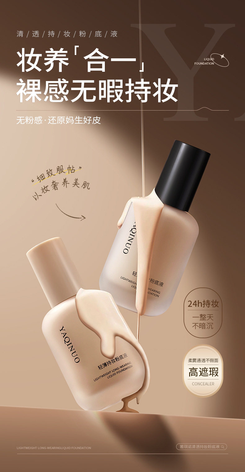 Yakino Light and Long-Lasting Liquid Foundation, Long-Lasting Moisturizing, Non-Removing Makeup, Concealer, Oil Control, Nourishing Dry Skin and Oily Skin Foundation Cream
