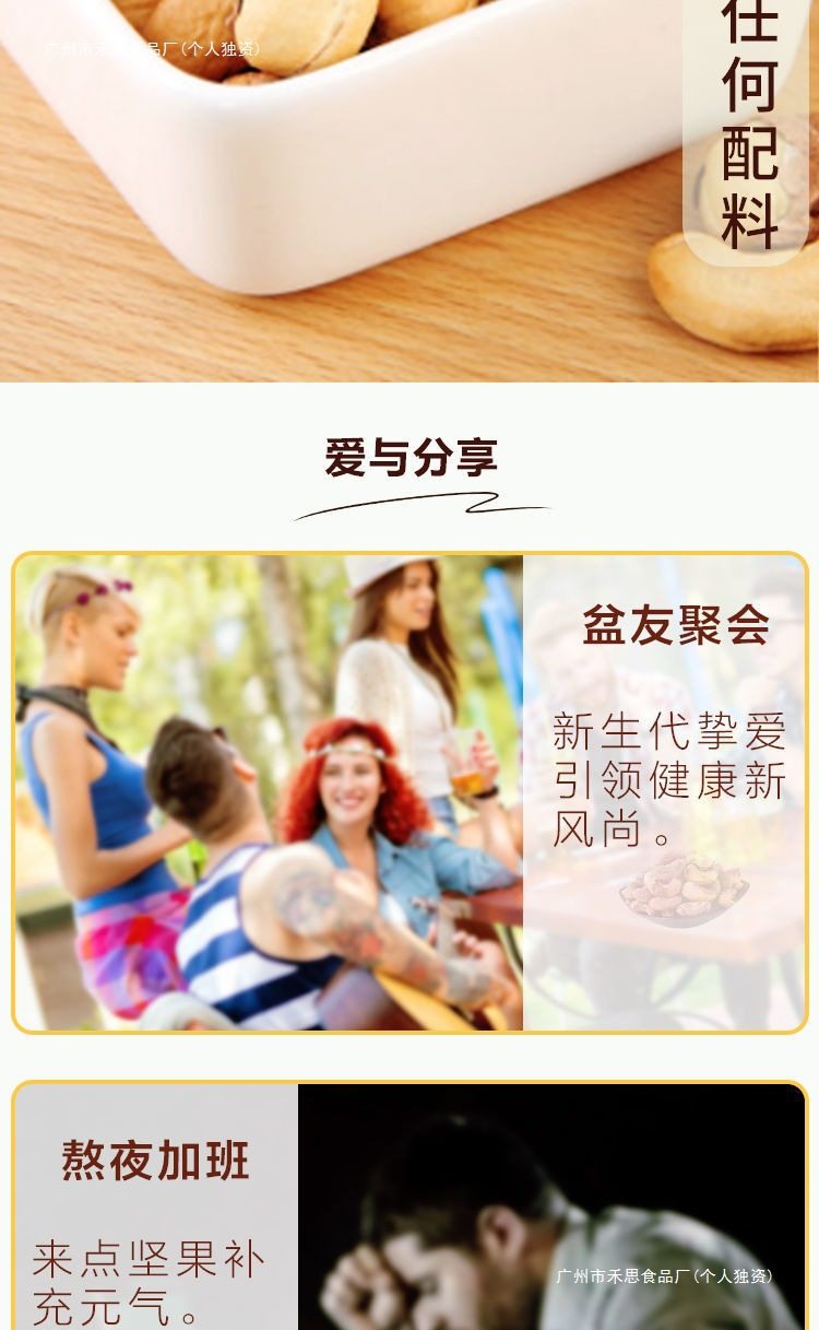 | Packaging specifications | Salt baked cashew nuts [bag] net weight 80g,Salt-baked cashew nuts [canned] net weight 150g,Original peeled cashew nuts [canned] net weight 150g,Salt-baked cashew nuts [bag] net weight 250g,Original peeled cashew nuts [bag] net weight 250g,A180 original cashew nuts [net weight 250g in bag],Salt-baked cashew nuts [large can] net weight 500g,Original peeled cashew nuts [large can] net weight 500g,A180 original cashew nuts [net weight 500g in can] |