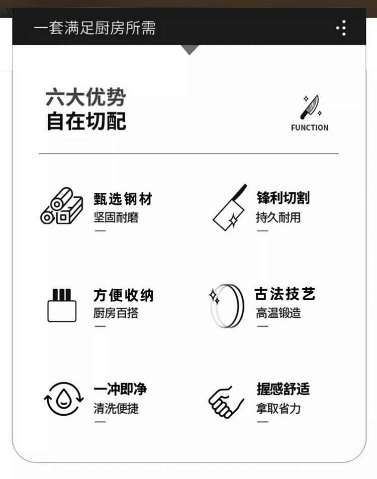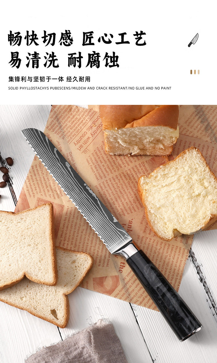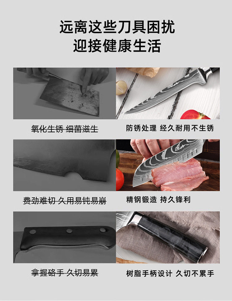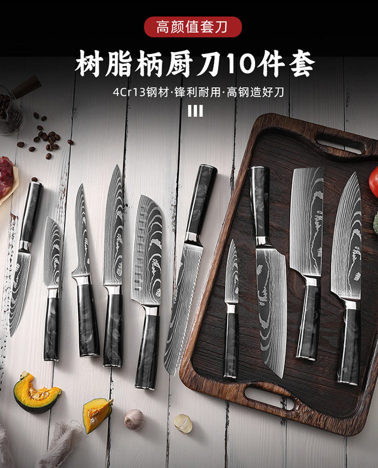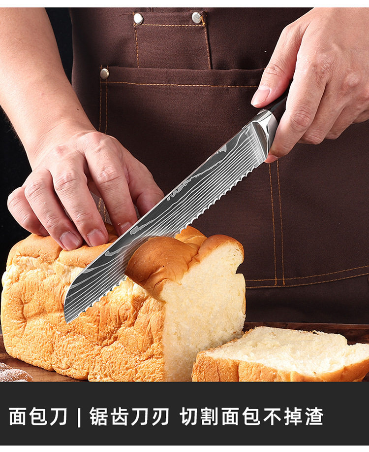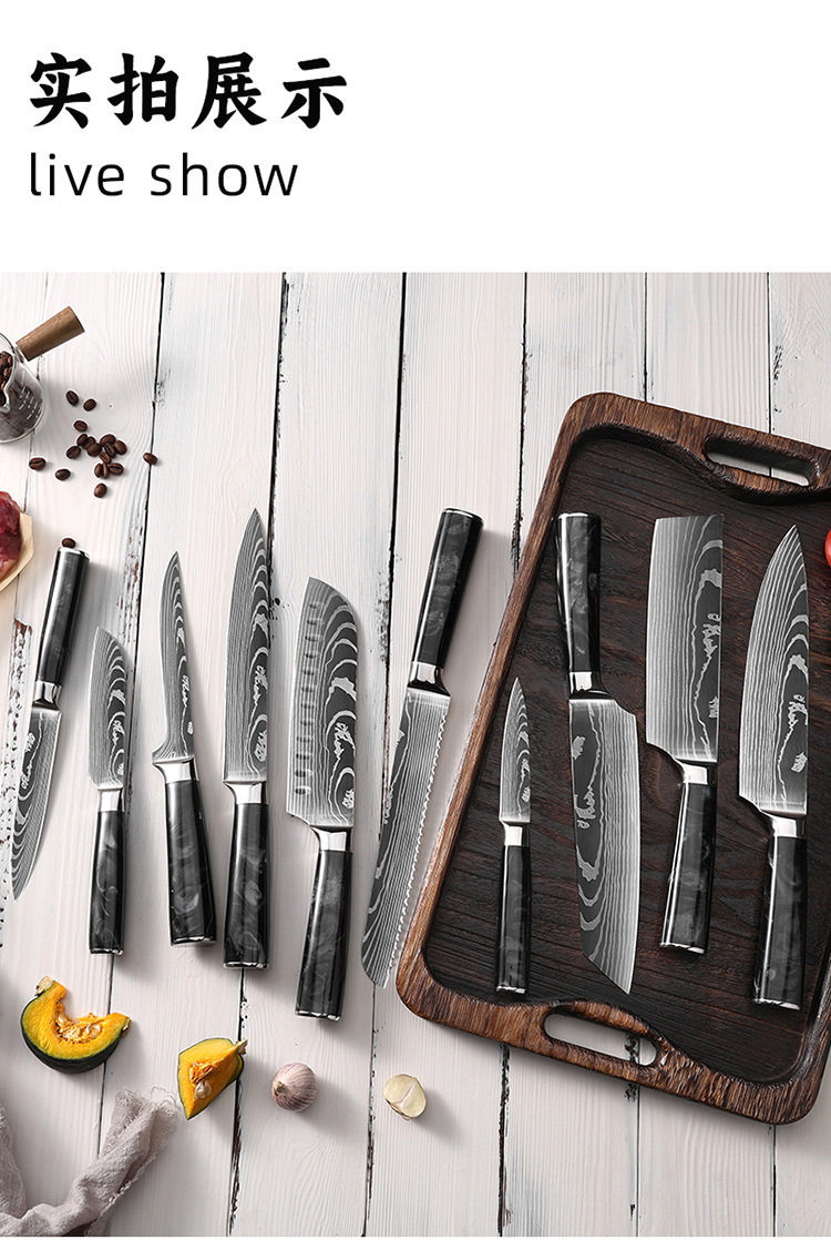 Specification 8inch cutting knife (black),8inch bread knife (black),8inch chef's knife (black),8inch carving knife (black),7inch santoku knife (black),7inch small kitchen knife (black),6inch boning knife (black),5inch small santoku knife (black),5-inch utility knife (black),3.5inch fruit knife (black),Two-piece set (black),Three-piece set (black),Four-piece set (black),Five-piece set (black),Six-piece set (black),Seven-piece set (black),Eight-piece set (black),Nine-piece set (black),Ten-piece set (black)