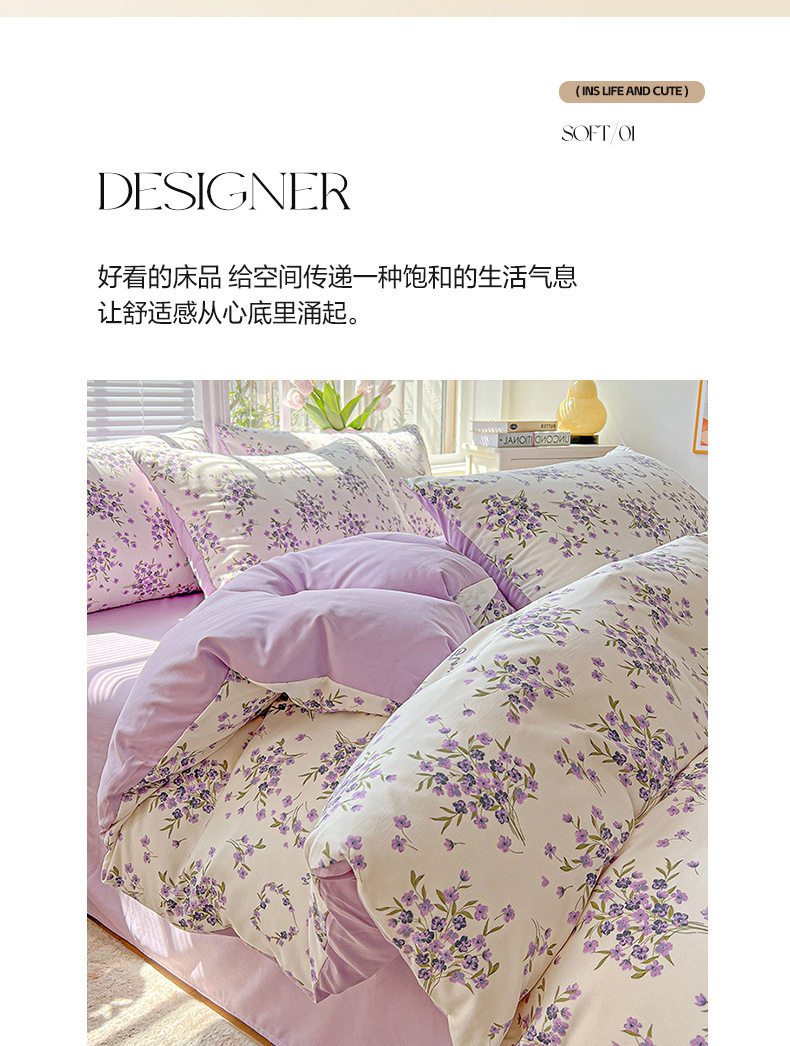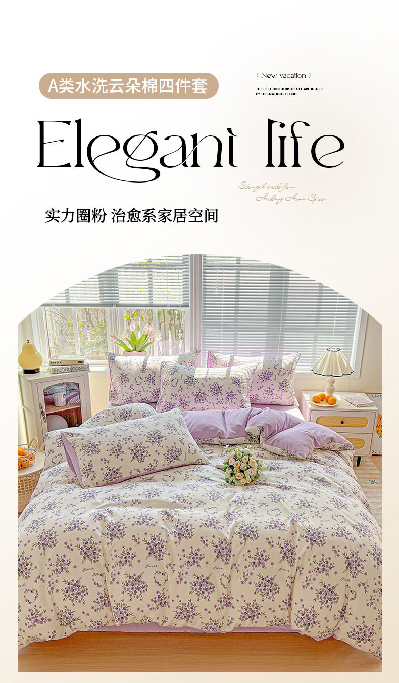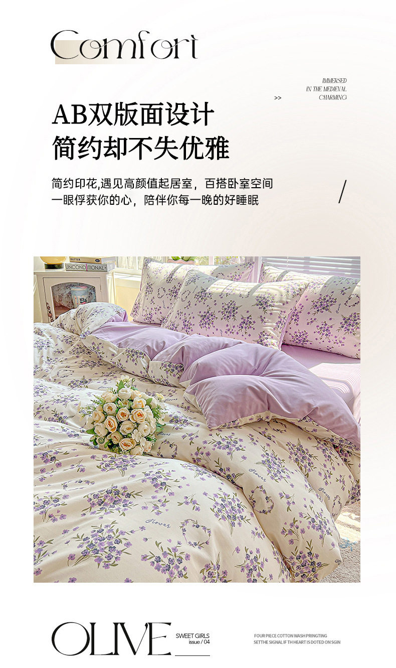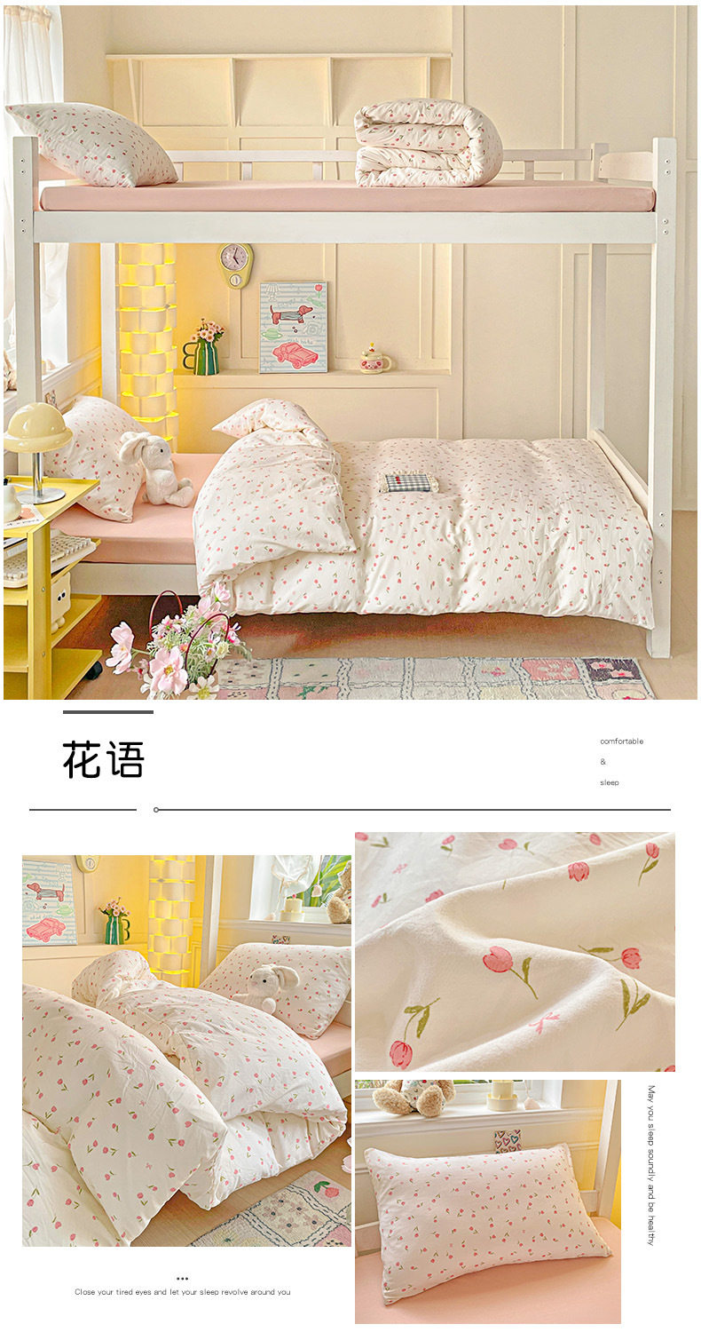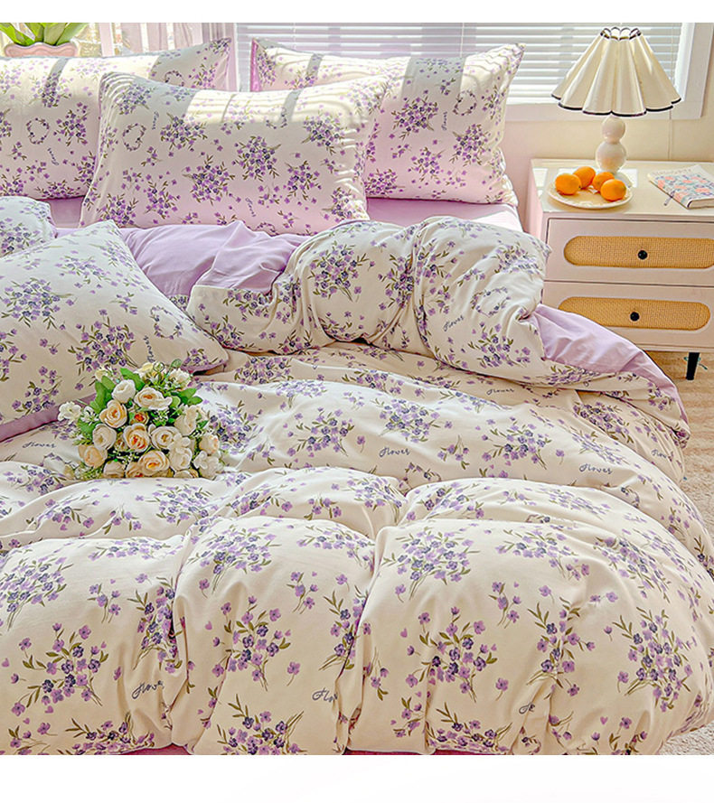 Class a Washed Cotton Printed Bed Four-Piece Set Small Fresh Quilt Cover Bed Sheets Pillowcase Home Student Dormitory Three-Piece Set a