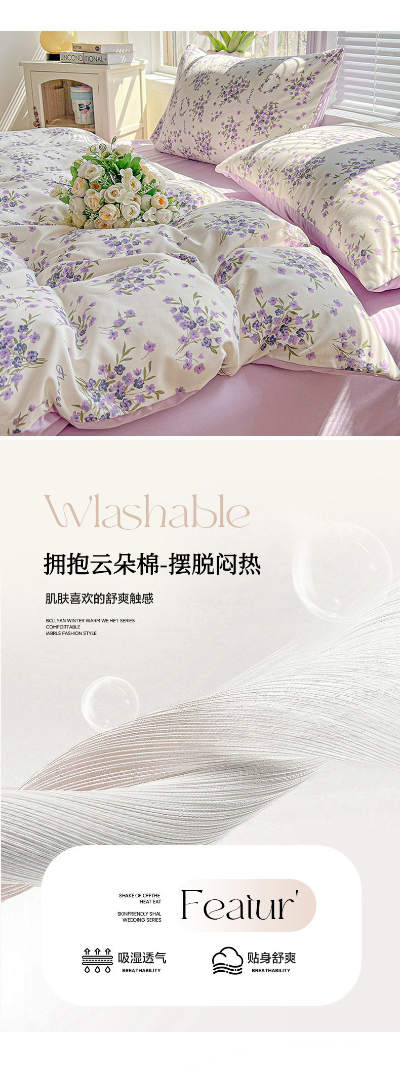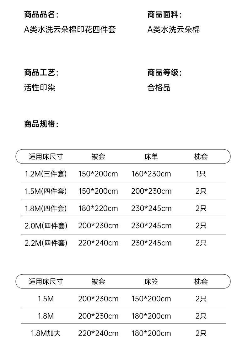 | Size Specifications | 150*200cm single quilt cover,160*220cm single quilt cover,180*220cm single quilt cover,200*230cm single quilt cover,220*240cm single quilt cover,0.9-1.2m bed sheet three-piece quilt cover 1.5*2.0,1.5m bed sheet four-piece quilt cover 1.5*2.0,1.8m bed sheet four-piece quilt cover 1.8*2.2,2.0m bed sheet four-piece quilt cover 2*2.3,2.2m bed sheet four-piece quilt cover 2.2*2.4,0.9 fitted sheet (quilt cover 1.5) three-piece set,1.2 fitted sheet (quilt cover 1.5) three-piece set,1.5 fitted sheet (quilt cover 1.5) four-piece set,1.5 fitted sheet (quilt cover 2.0) four-piece set,1.8 fitted sheet (quilt cover 1.8) four-piece set,1.8 fitted sheet (quilt cover 2.0) four-piece set,1.8 fitted sheet (quilt cover 2.2) four-piece set,2.0 fitted sheet (quilt cover 2.0) four-piece set,2.0 fitted sheet (quilt cover 2.2) four-piece set |