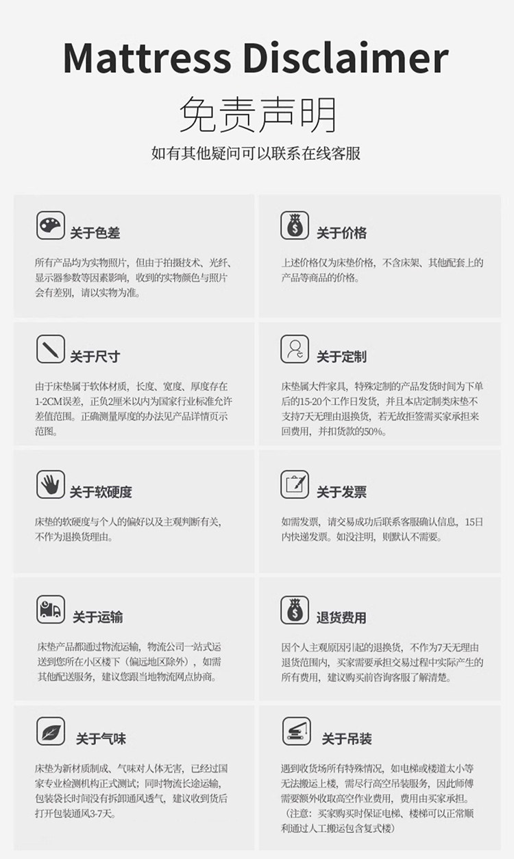 | Color | Classic model: basic guest room [moderate softness and hardness/22cm thick],Dream model: spine protection and waist protection [harder sleeping feel/22cm thick],Yunmeng model: soft and zero pressure [slightly soft when sleeping/24cm thick],Dream model: double-sided sleeping feeling [soft and hard sides/25cm thick],Dream chaser model: soft in the cloud [q-elastic soft/26cm thick],Hilton recommended model: shipped in roll package [soft cloud feel/30cm thick] |