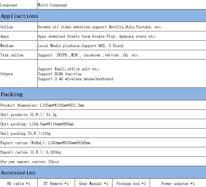 | Packing list | Hd cable*1 infrared remote control*1 instruction manual*1 bare metal*1 power adapter*1 |