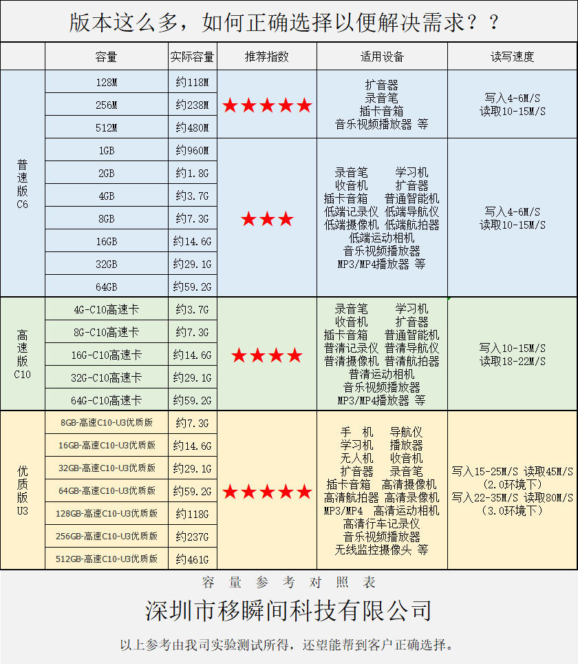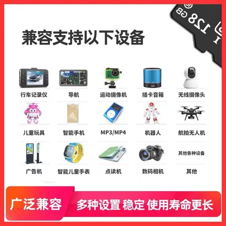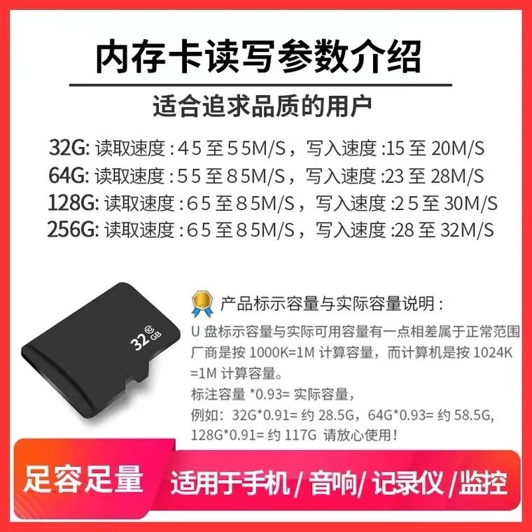 | Capacity | 256MB,512MB,1GB,2GB,4GB,8gb (high-speed c10-u3 high-quality version),16gb (high-speed c10-u3 high-quality version),32gb (high-speed c10-u3 high-quality version),64gb (high-speed c10-u3 high-quality version),128gb (high-speed c10-u3 high-quality version),256b (high-speed u3 high-quality version),512b (high-speed u3 high-quality version),1tb (high-speed u3 high-quality version),2tb (high-speed u3 high-quality version) |