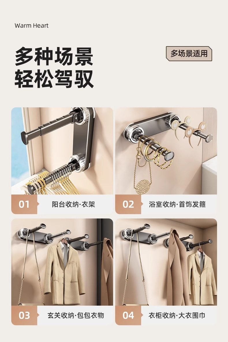 | Color | Double pole clothes rail-milk white,Single pole clothes rail-milk white,Double pole clothes rail-gun gray,Single pole clothes rail-gun gray,Suction cup telescopic clothes hanger storage rack-gun gray,Suction cup retractable clothes hanger storage rack-milk white |