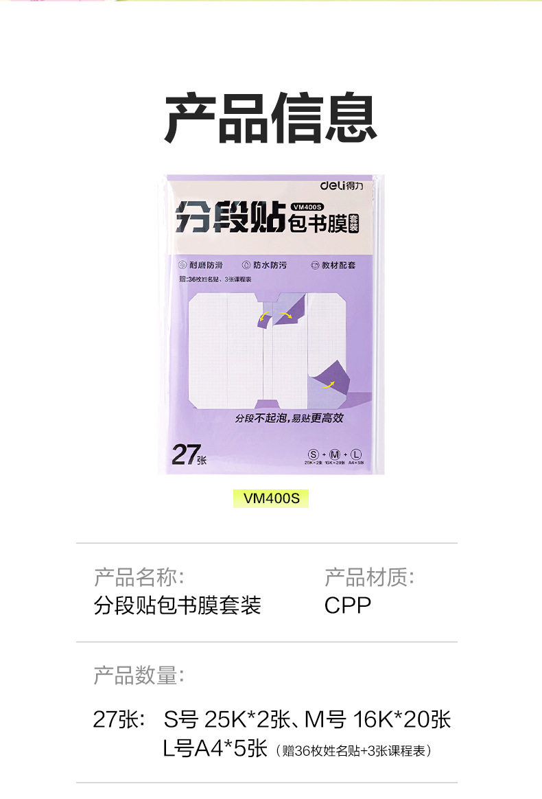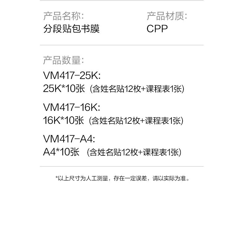 | Specification | Segmented easy book wrapping *large size [a4] 10 sheets *free name stickers + course schedule,Segmented easy book wrapping*medium size [16k] 10 sheets*free name sticker + course schedule,Segmented easy book wrapping *small size [25k] 10 sheets *free name sticker + course schedule,Segmented easy book binding *set of 27 sheets [5 large sheets + 20 medium sheets + 2 small sheets] *free name stickers + course schedule,Segmented easy book wrapping*medium size [16k] 10 sheets*free name stickers,Segmented easy book wrapping*small size [25k] 10 sheets*free name stickers,Segmented easy book wrapping* set of 27 sheets [5 large sheets + 20 medium sheets + 2 small sheets] * free name stickers,Corner-cut book wrapping film (not segmented) *small size [32k] 10 sheets *free name stickers |