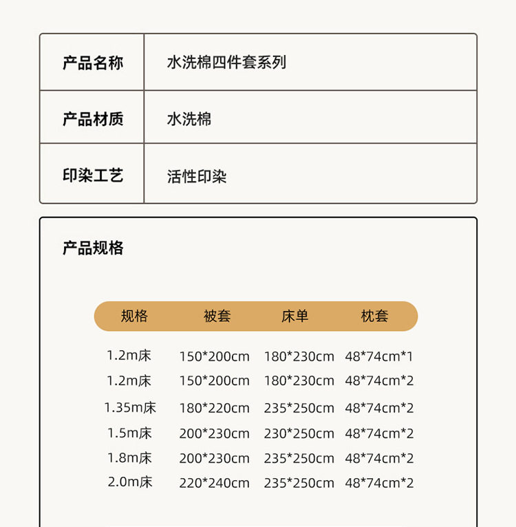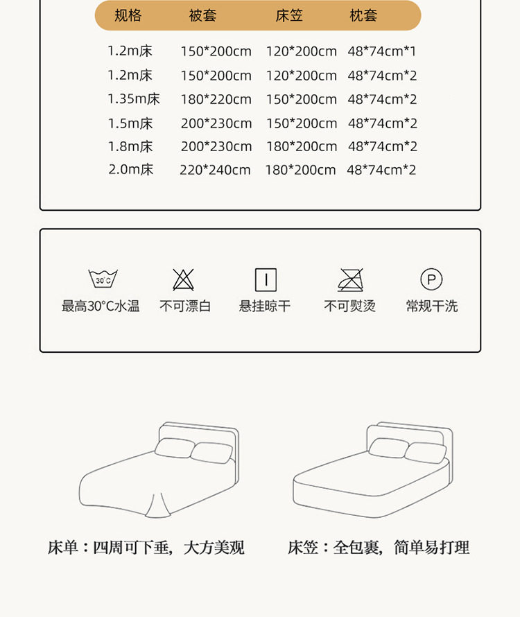 | Dimensions | 1.2m bed sheet three-piece set [quilt cover 150*200cm bed sheet 160*230cm pillowcase 1 piece],1.5m bed sheet four-piece set [quilt cover 150*200cm bed sheet 180*230cm pillowcase 2 pieces],1.8m bed sheet four-piece set [quilt cover 180*220cm bed sheet 235*245cm pillowcase 2 pieces],2.0m bed sheet four-piece set [quilt cover 200*230cm bed sheet 235*245cm pillowcase 2 pieces],2.2m bed sheet four-piece set [quilt cover 220*240cm bed sheet 235*245cm pillowcase 2 pieces],1.5m fitted sheet set of four [quilt cover 150*200cm fitted sheet 150*200cm pillowcase 2 pieces],1.5m fitted sheet set of four [quilt cover 200*230cm fitted sheet 150*200cm pillowcase 2 pieces],1.8m fitted sheet set of four [quilt cover 180*220cm, fitted sheet 180*200cm, 2 pillowcases],1.8m fitted sheet set of four [quilt cover 200*230cm fitted sheet 180*200cm pillowcase 2 pieces],150*200cm [single quilt cover],180*220cm [single quilt cover],200*230cm [single quilt cover],One pillowcase 48*74cm |