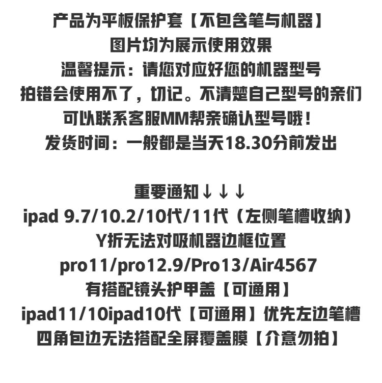 | Applicable models | Ipad 11th generation (a16),2021 ipad9 (10.2inch),2020 ipad8 (10.2inch),2019 ipad7 (10.2inch),Ipad 10th generation (10.9inch),2018 ipad6 ( 9.7inch ),2017 ipad5 (9.7inch),Ipadair6/7 ( 11inch ),Air5/air4 ( 10.9inch ),Ipadair3/pro ( 10.5inch,Air2/air1 ( 9.7inch ),2024 pro ( 11inch ),22/21/20 pro( 11inch ),2018 pro (11inch),Mini7 ( 8.3inch ),Mini6( 8.3inch ),2024 pro ( 13inch ),22/21/20 pro( 12.9inch ),2018 pro (12.9inch),Ipadair6/7 ( 13inch ) |